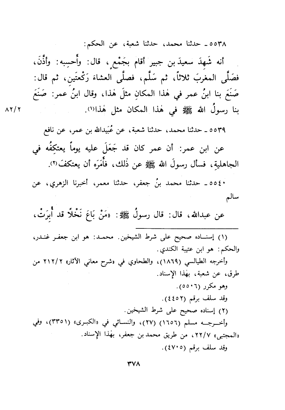 ٥٥٣٨ - حَدَّثَنَا مُحَمَّدٌ، حَدَّثَنَا شُعْبَةُ، عَنِ الْحَكَمِ، أَنَّهُ شَهِدَ سَعِيدَ بْنَ جُبَيْرٍ أَقَامَ بِجَمْعٍ قَالَ: وَأَحْسِبُهُ وَأَذَّنَ فَصَلَّى الْمَغْرِبَ ثَلَاثًا، ثُمَّ سَلَّمَ فَصَلَّى الْعِشَاءَ رَكْعَتَيْنِ ثُمَّ قَالَ: صَنَعَ بِنَا ابْنُ عُمَرَ فِي هَذَا الْمَكَانِ مِثْلَ هَذَا، وَقَالَ ابْنُ عُمَرَ: " صَنَعَ بِنَا رَسُولُ اللهِ صَلَّى اللهُ عَلَيْهِ وَسَلَّمَ فِي هَذَا الْمَكَانِ مِثْلَ هَذَا " (١)