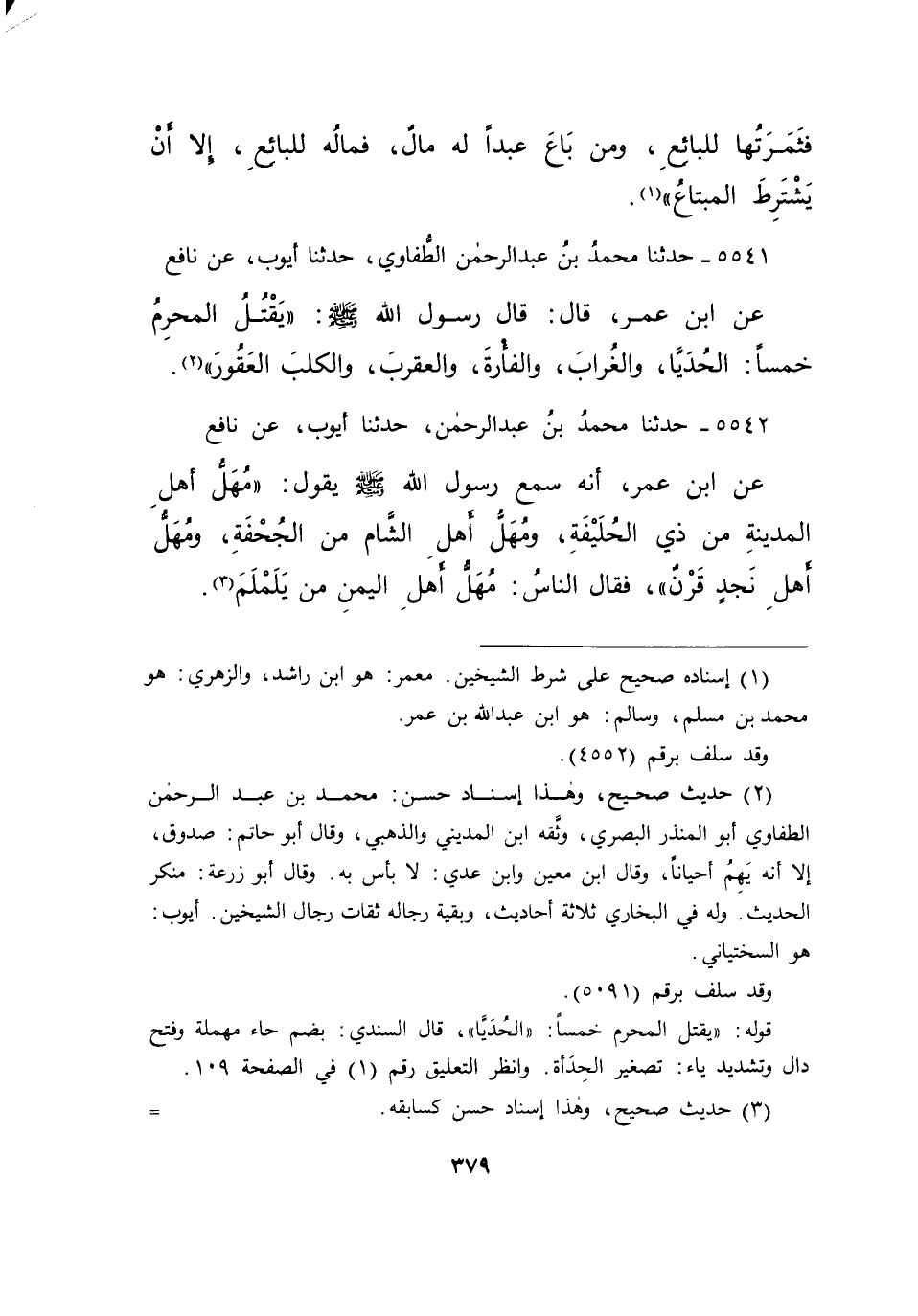 ٥٥٤١ - حَدَّثَنَا مُحَمَّدُ بْنُ عَبْدِ الرَّحْمَنِ الطُّفَاوِيُّ، حَدَّثَنَا أَيُّوبُ، عَنْ نَافِعٍ، عَنِ ابْنِ عُمَرَ قَالَ: قَالَ رَسُولُ اللهِ صَلَّى اللهُ عَلَيْهِ وَسَلَّمَ: " يَقْتُلُ الْمُحْرِمُ خَمْسًا: الْحُدَيَّا، وَالْغُرَابَ، وَالْفَأْرَةَ، وَالْعَقْرَبَ، وَالْكَلْبَ الْعَقُورَ " (٢)
