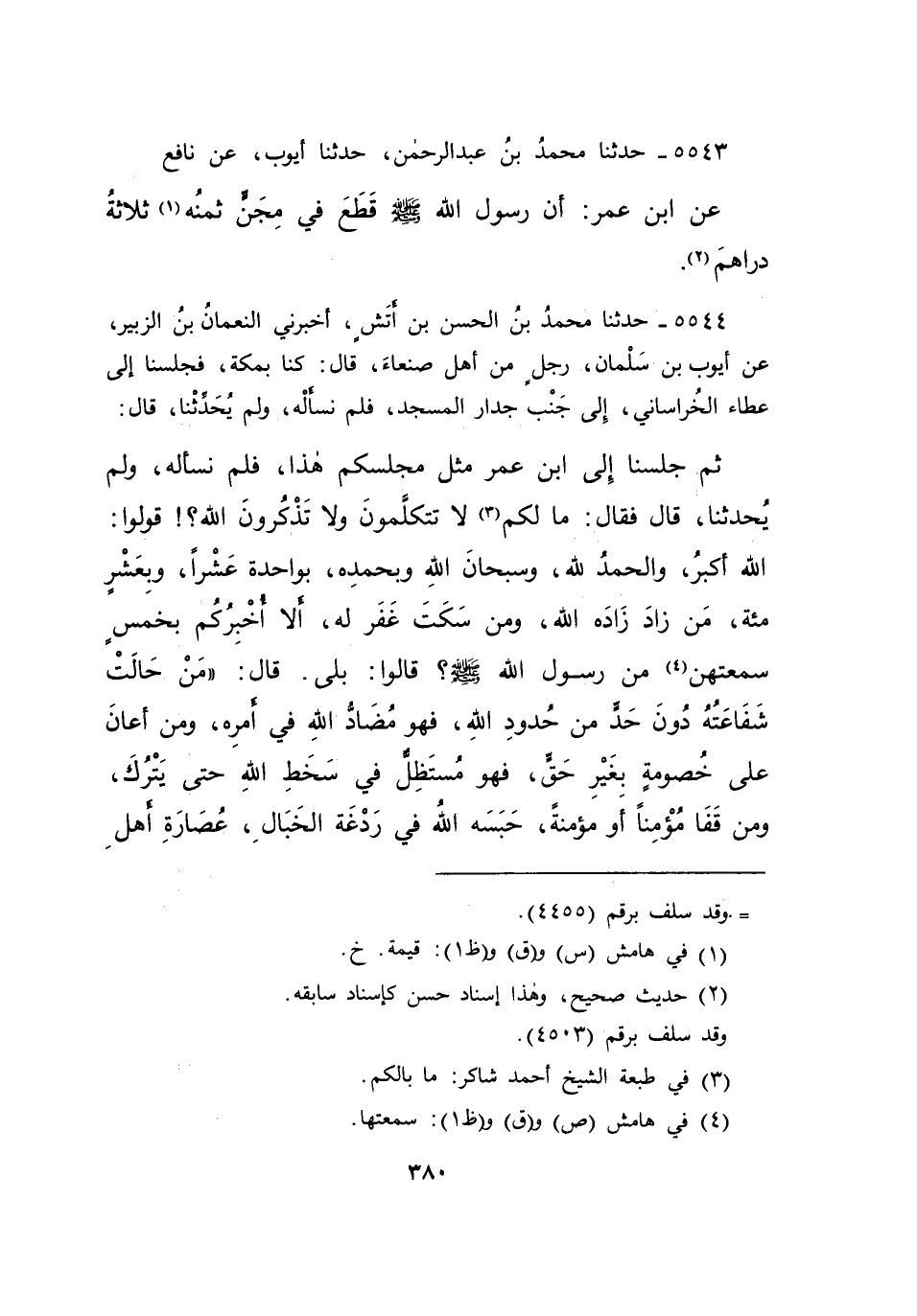 ٥٥٤٤ - حَدَّثَنَا مُحَمَّدُ بْنُ الْحَسَنِ بْنِ أَتَشٍ، أَخْبَرَنِي النُّعْمَانُ بْنُ الزُّبَيْرِ، عَنْ أَيُّوبَ بْنِ سَلْمَانَ، رَجُلٍ مِنْ أَهْلِ صَنْعَاءَ قَالَ: كُنَّا بِمَكَّةَ فَجَلَسْنَا إِلَى عَطَاءٍ الْخُرَاسَانِيِّ، إِلَى جَنْبِ جِدَارِ الْمَسْجِدِ، فَلَمْ نَسْأَلْهُ وَلَمْ يُحَدِّثْنَا قَالَ: ثُمَّ جَلَسْنَا إِلَى ابْنِ عُمَرَ، مِثْلَ مَجْلِسِكُمْ هَذَا فَلَمْ نَسْأَلْهُ، وَلَمْ يُحَدِّثْنَا. قَالَ: فَقَالَ: مَا لَكُمْ (٣) لَا تَتَكَلَّمُونَ وَلَا تَذْكُرُونَ اللهَ قُولُوا: اللهُ أَكْبَرُ، وَالْحَمْدُ لِلَّهِ، وَسُبْحَانَ اللهِ وَبِحَمْدِهِ، بِوَاحِدَةٍ عَشْرًا، وَبِعَشْرٍ مِائَةً، مَنْ زَادَ زَادَهُ اللهُ، وَمَنْ سَكَتَ غَفَرَ لَهُ، أَلَا أُخْبِرُكُمْ بِخَمْسٍ سَمِعْتُهُنَّ (٤) مِنْ رَسُولِ اللهِ صَلَّى اللهُ عَلَيْهِ وَسَلَّمَ؟ قَالُوا: بَلَى، قَالَ: " مَنْ حَالَتْ شَفَاعَتُهُ دُونَ حَدٍّ مِنْ حُدُودِ اللهِ، فَهُوَ مُضَادُّ اللهِ فِي أَمْرِهِ، وَمَنْ أَعَانَ عَلَى خُصُومَةٍ بِغَيْرِ حَقٍّ، فَهُوَ مُسْتَظِلٌّ فِي سَخَطِ اللهِ حَتَّى يَتْرُكَ، وَمَنْ قَفَا مُؤْمِنًا أَوْ مُؤْمِنَةً، حَبَسَهُ اللهُ فِي رَدْغَةِ الْخَبَالِ عُصَارَةِ أَهْلِ