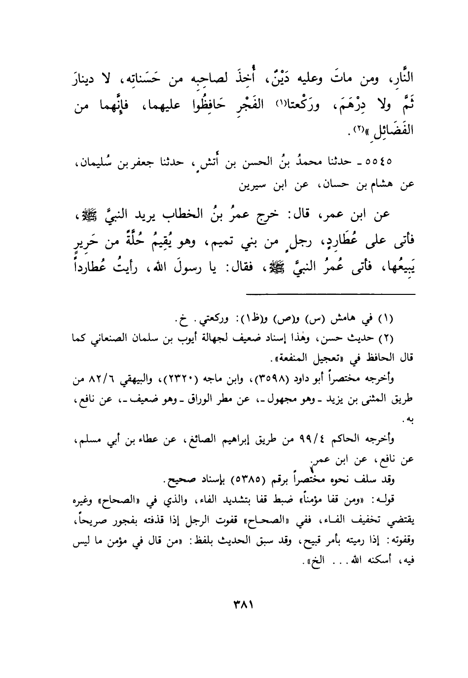 النَّارِ، وَمَنْ مَاتَ وَعَلَيْهِ دَيْنٌ، أُخِذَ لِصَاحِبِهِ مِنْ حَسَنَاتِهِ، لَا دِينَارَ، ثَمَّ وَلَا دِرْهَمَ، وَرَكْعَتَا (١) الْفَجْرِ حَافِظُوا عَلَيْهِمَا فَإِنَّهُمَا مِنَ الْفَضَائِلِ " (٢)