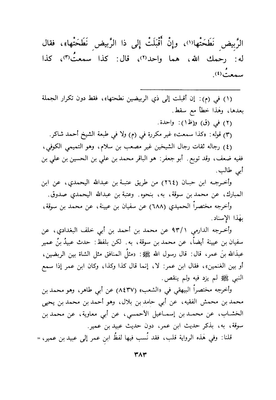 وأخرجه الدارمي ١/٩٣ عن محمد بن أحمد بن أبي خلف البغدادي، عن سفيان بن عيينة أيضاً، عن محمد بن سوقة، به. لكن بلفظ: حدث عبيد بنُ عمير عبدَالله بنَ عمر، قال: قال رسول الله صَلَّى اللهُ عَلَيْهِ وَسَلَّمَ: "مثلُ المنافق مثل الشاة بين الربضين، أو بين الغنمين"، فقال ابن عمر: لا، إنما قال كذا وكذا، وكان ابن عمر إذا سمع النبي صَلَّى اللهُ عَلَيْهِ وَسَلَّمَ لم يزد فيه ولم ينقص.