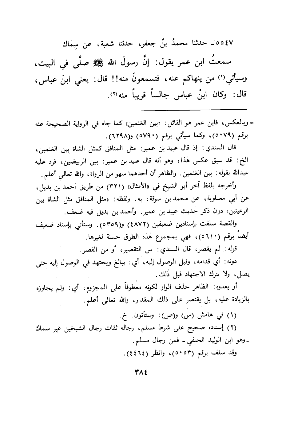 ٥٥٤٧ - حَدَّثَنَا مُحَمَّدُ بْنُ جَعْفَرٍ، حَدَّثَنَا شُعْبَةُ، عَنْ سِمَاكٍ، سَمِعْتُ ابْنَ عُمَرَ يَقُولُ: " إِنَّ رَسُولَ اللهِ صَلَّى اللهُ عَلَيْهِ وَسَلَّمَ صَلَّى فِي الْبَيْتِ " وَسَيَأْتِي (١) مَنْ يَنْهَاكُمْ عَنْهُ، فَتَسْمَعُونَ مِنْهُ، قَالَ: يَعْنِي ابْنَ عَبَّاسٍ - قَالَ: وَكَانَ ابْنُ عَبَّاسٍ جَالِسًا قَرِيبًا مِنْهُ (٢)
