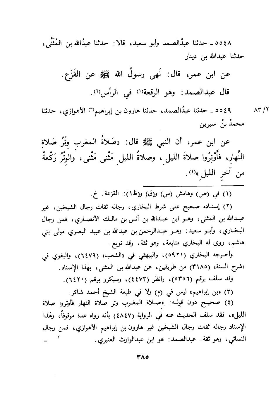 ٥٥٤٩ - حَدَّثَنَا عَبْدُ الصَّمَدِ، حَدَّثَنَا هَارُونُ بْنُ إِبْرَاهِيمَ (٣) الْأَهْوَازِيُّ، حَدَّثَنَا مُحَمَّدُ بْنُ سِيرِينَ، عَنِ ابْنِ عُمَرَ، أَنَّ النَّبِيَّ صَلَّى اللهُ عَلَيْهِ وَسَلَّمَ قَالَ: " صَلَاةُ الْمَغْرِبِ وِتْرُ صَلَاةِ النَّهَارِ، فَأَوْتِرُوا صَلَاةَ اللَّيْلِ، وَصَلَاةُ اللَّيْلِ مَثْنَى مَثْنَى، وَالْوَتْرُ رَكْعَةٌ مِنْ آخِرِ اللَّيْلِ " (٤)