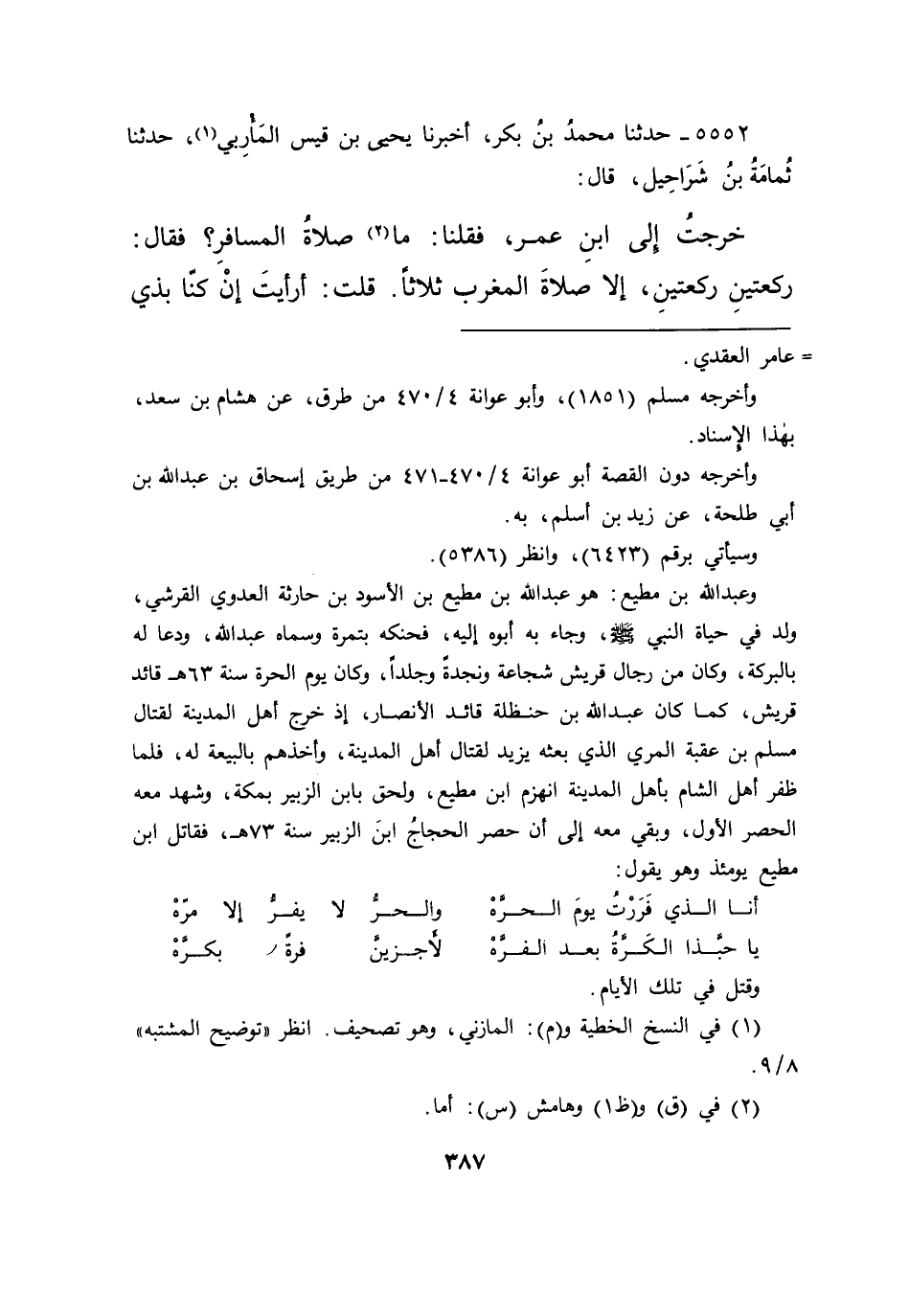 ٥٥٥٢ - حَدَّثَنَا مُحَمَّدُ بْنُ بَكْرٍ، أَخْبَرَنَا يَحْيَى بْنُ قَيْسٍ الْمَأْرِبِيُّ، (١) حَدَّثَنَا ثُمَامَةُ بْنُ شَرَاحِيلَ قَالَ: خَرَجْتُ إِلَى ابْنِ عُمَرَ، فَقُلْنَا مَا (٢) صَلَاةُ الْمُسَافِرِ؟ فَقَالَ: رَكْعَتَيْنِ رَكْعَتَيْنِ، إِلَّا صَلَاةَ الْمَغْرِبِ ثَلَاثًا، قُلْتُ: أَرَأَيْتَ إِنْ كُنَّا بِذِي