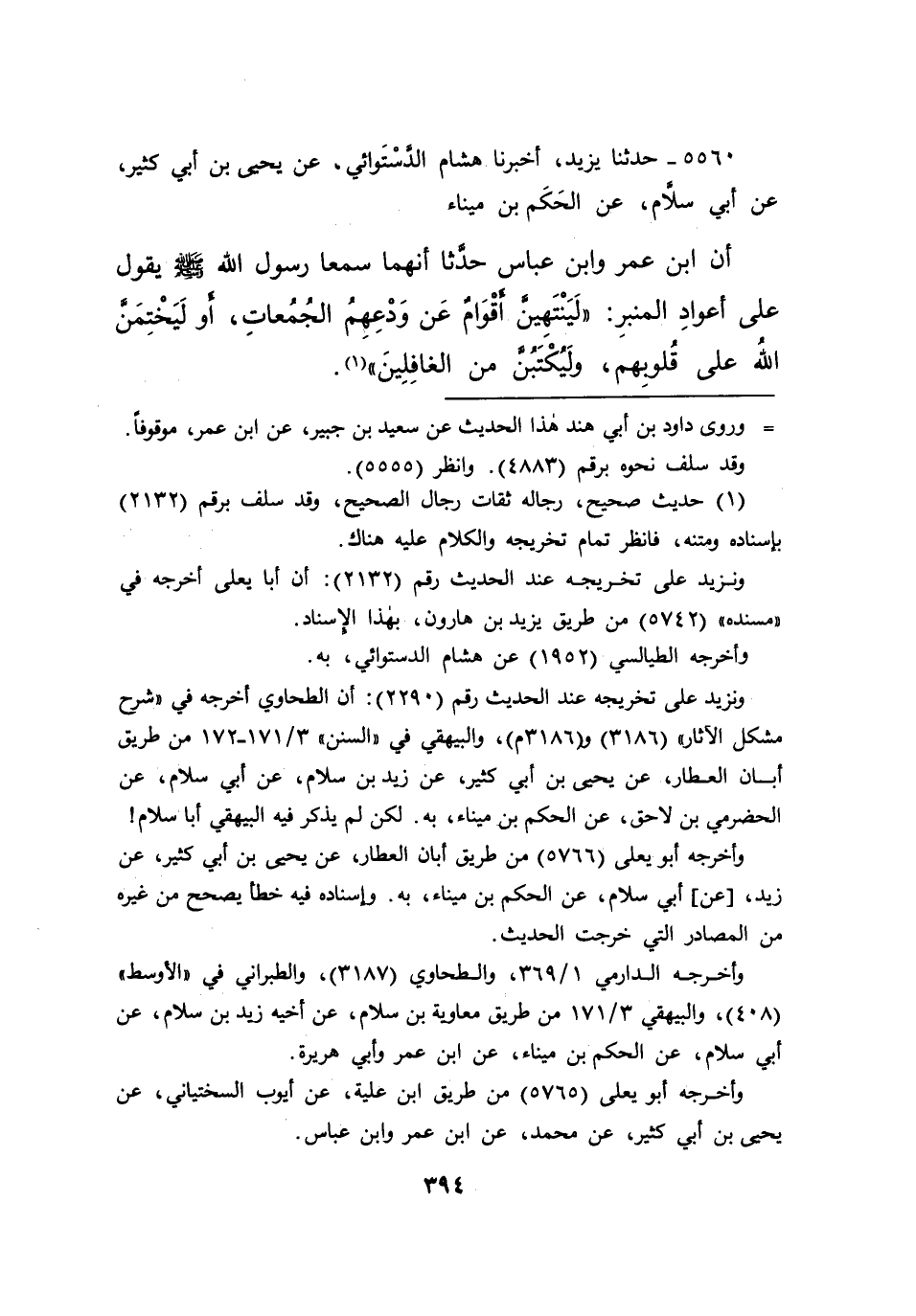 ٥٥٦٠ - حَدَّثَنَا يَزِيدُ، أَخْبَرَنَا هِشَامٌ الدَّسْتُوَائِيُّ، عَنْ يَحْيَى بْنِ أَبِي كَثِيرٍ، عَنْ أَبِي سَلَّامٍ، عَنِ الْحَكَمِ بْنِ مِينَاءَ، أَنَّ ابْنَ عُمَرَ، وَابْنَ عَبَّاسٍ حَدَّثَا أَنَّهُمَا سَمِعَا رَسُولَ اللهِ صَلَّى اللهُ عَلَيْهِ وَسَلَّمَ يَقُولُ عَلَى أَعْوَادِ الْمِنْبَرِ: " لَيَنْتَهِيَنَّ أَقْوَامٌ عَنْ وَدْعِهِمُ الْجُمُعَاتِ، أَوْ لَيَخْتِمَنَّ اللهُ عَلَى قُلُوبِهِمْ، وَلَيُكْتَبُنَّ مِنَ الْغَافِلِينَ " (١)