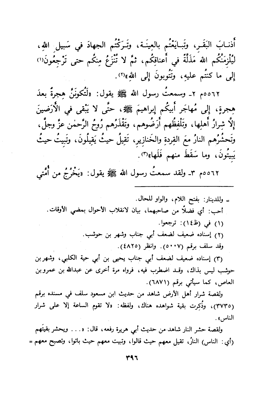 وَسَمِعْتُ رَسُولَ اللهِ صَلَّى اللهُ عَلَيْهِ وَسَلَّمَ يَقُولُ: " لَتَكُونَنَّ هِجْرَةٌ بَعْدَ هِجْرَةٍ إِلَى مُهَاجَرِ أَبِيكُمْ إِبْرَاهِيمَ صَلَّى اللهُ عَلَيْهِ وَسَلَّمَ، حَتَّى لَا يَبْقَى فِي الْأَرَضِينَ إِلَّا شِرَارُ أَهْلِهَا، وَتَلْفِظُهُمْ أَرَضُوهُمْ، وَتَقْذَرُهُمْ رُوحُ الرَّحْمَنِ عَزَّ وَجَلَّ، وَتَحْشُرُهُمُ النَّارُ مَعَ الْقِرَدَةِ وَالْخَنَازِيرِ، تَقِيلُ حَيْثُ يَقِيلُونَ، وَتَبِيتُ حَيْثُ يَبِيتُونَ، وَمَا سَقَطَ مِنْهُمْ فَلَهَا " (٣)