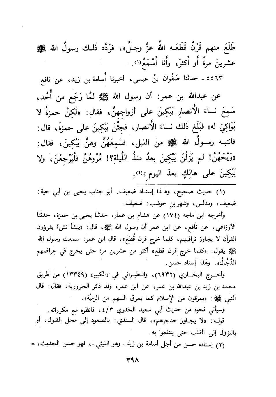 ٥٥٦٣ - حَدَّثَنَا صَفْوَانُ بْنُ عِيسَى، أَخْبَرَنَا أُسَامَةُ بْنُ زَيْدٍ، عَنْ نَافِعٍ، عَنْ عَبْدِ اللهِ بْنِ عُمَرَ، أَنَّ رَسُولَ اللهِ صَلَّى اللهُ عَلَيْهِ وَسَلَّمَ لَمَّا رَجَعَ مِنْ أُحُدٍ سَمِعَ نِسَاءَ الْأَنْصَارِ يَبْكِينَ عَلَى أَزْوَاجِهِنَّ، فَقَالَ: لَكِنْ حَمْزَةُ لَا بَوَاكِيَ لَهُ، فَبَلَغَ ذَلِكَ نِسَاءَ الْأَنْصَارِ فَجِئْنَ يَبْكِينَ عَلَى حَمْزَةَ قَالَ: فَانْتَبَهَ رَسُولُ اللهِ صَلَّى اللهُ عَلَيْهِ وَسَلَّمَ مِنَ اللَّيْلِ فَسَمِعَهُنَّ وَهُنَّ يَبْكِينَ، فَقَالَ: " وَيْحَهُنَّ لَمْ يَزَلْنَ يَبْكِينَ بَعْدُ مُنْذُ اللَّيْلَةِ مُرُوهُنَّ فَلْيَرْجِعْنَ، وَلَا يَبْكِينَ عَلَى هَالِكٍ بَعْدَ الْيَوْمِ " (٢)