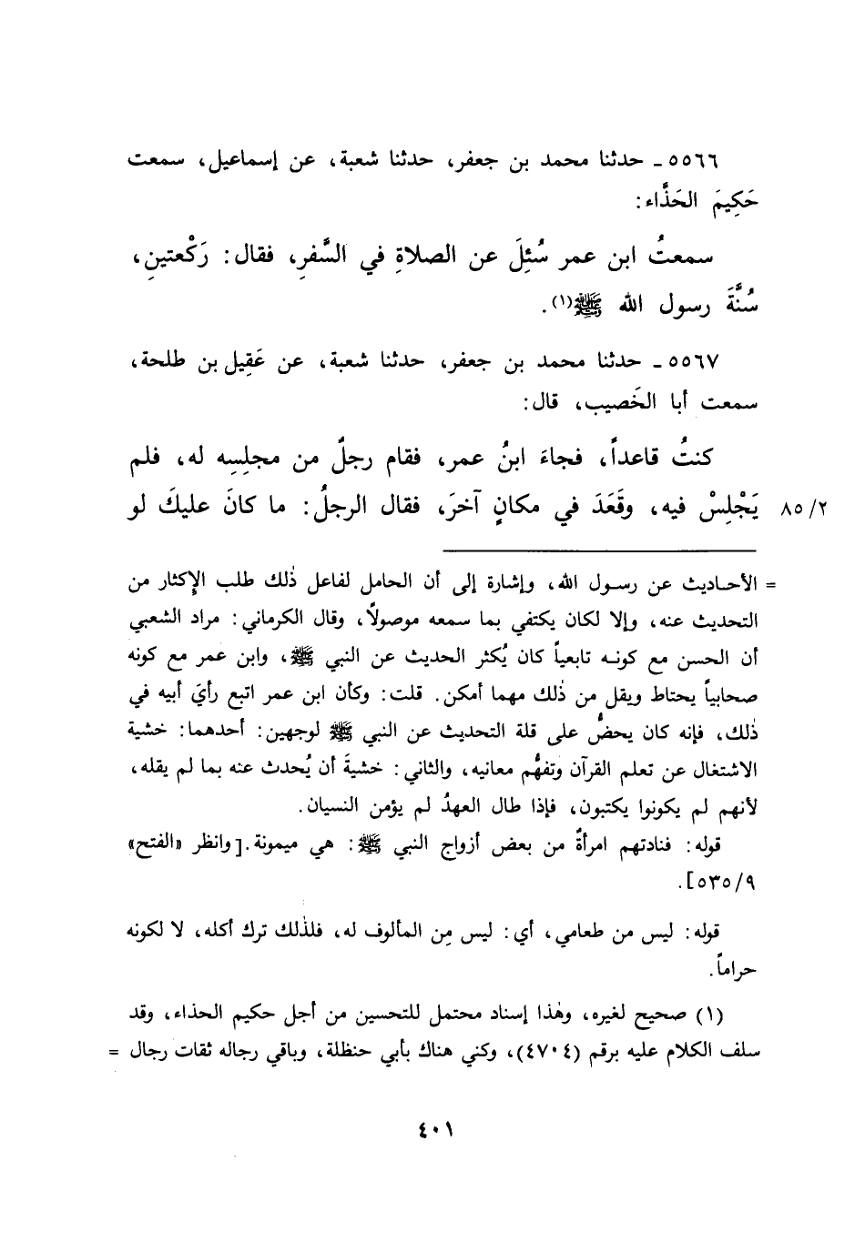 ٥٥٦٦ - حَدَّثَنَا مُحَمَّدُ بْنُ جَعْفَرٍ، حَدَّثَنَا شُعْبَةُ، عَنْ إِسْمَاعِيلَ، سَمِعْتُ حَكِيمًا الْحَذَّاءَ، سَمِعْتُ ابْنَ عُمَرَ، سُئِلَ عَنِ الصَّلَاةِ فِي السَّفَرِ؟ فَقَالَ: " رَكْعَتَيْنِ سُنَّةُ رَسُولِ اللهِ صَلَّى اللهُ عَلَيْهِ وَسَلَّمَ " (١)