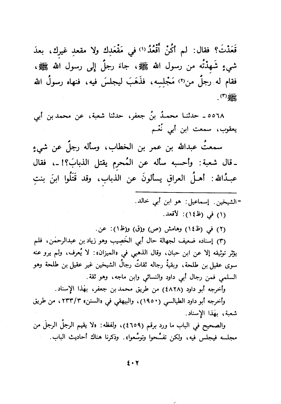 ٥٥٦٨ - حَدَّثَنَا مُحَمَّدُ بْنُ جَعْفَرٍ، حَدَّثَنَا شُعْبَةُ، عَنْ مُحَمَّدِ بْنِ أَبِي يَعْقُوبَ، سَمِعْتُ ابْنَ أَبِي نُعْمٍ، سَمِعْتُ عَبْدَ اللهِ بْنَ عُمَرَ بْنِ الْخَطَّابِ، وَسَأَلَهُ رَجُلٌ عَنْ شَيْءٍ - قَالَ شُعْبَةُ: وَأَحْسِبُهُ سَأَلَهُ عَنِ الْمُحْرِمِ يَقْتُلُ الذُّبَابَ؟ - فَقَالَ عَبْدُ اللهِ: أَهْلُ الْعِرَاقِ يَسْأَلُونَ عَنِ الذُّبَابِ، وَقَدْ قَتَلُوا ابْنَ بِنْتِ