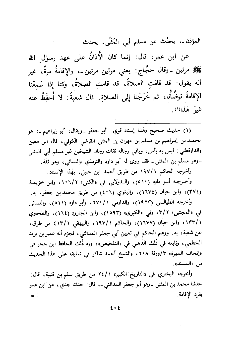 الْمُؤَذِّنَ، يُحَدِّثُ عَنْ مُسْلِمٍ أَبِي الْمُثَنَّى، يُحَدِّثُ عَنِ ابْنِ عُمَرَ قَالَ: " إِنَّمَا كَانَ الْأَذَانُ عَلَى عَهْدِ رَسُولِ اللهِ صَلَّى اللهُ عَلَيْهِ وَسَلَّمَ مَرَّتَيْنِ - وَقَالَ حَجَّاجٌ: يَعْنِي مَرَّتَيْنِ مَرَّتَيْنِ - وَالْإِقَامَةُ مَرَّةً، غَيْرَ أَنَّهُ يَقُولُ: قَدْ قَامَتِ الصَّلَاةُ، قَدْ قَامَتِ الصَّلَاةُ، وَكُنَّا إِذَا سَمِعْنَا الْإِقَامَةَ تَوَضَّأْنَا، ثُمَّ خَرَجْنَا إِلَى الصَّلَاةِ " قَالَ شُعْبَةُ: " لَا أَحْفَظُ غَيْرَ هَذَا "، (١)