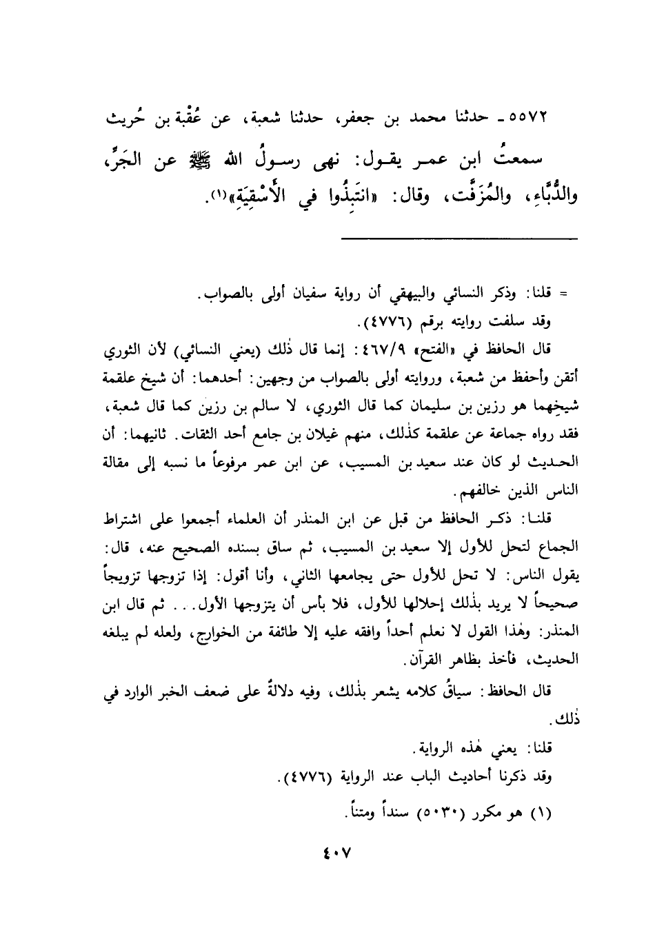 ٥٥٧٢ - حَدَّثَنَا مُحَمَّدُ بْنُ جَعْفَرٍ، حَدَّثَنَا شُعْبَةُ، عَنْ عُقْبَةَ بْنِ حُرَيْثٍ، سَمِعْتُ ابْنَ عُمَرَ يَقُولُ: نَهَى رَسُولُ اللهِ صَلَّى اللهُ عَلَيْهِ وَسَلَّمَ عَنِ الْجَرِّ، وَالدُّبَّاءِ، وَالْمُزَفَّتِ، وَقَالَ: " انْتَبِذُوا فِي الْأَسْقِيَةِ " (١)
