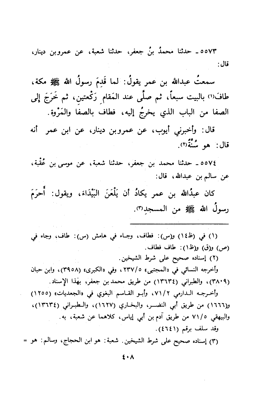 ٥٥٧٣ - حَدَّثَنَا مُحَمَّدُ بْنُ جَعْفَرٍ، حَدَّثَنَا شُعْبَةُ، عَنْ عَمْرِو بْنِ دِينَارٍ، سَمِعْتُ عَبْدَ اللهِ بْنَ عُمَرَ يَقُولُ: لَمَّا قَدِمَ رَسُولُ اللهِ صَلَّى اللهُ عَلَيْهِ وَسَلَّمَ مَكَّةَ " طَافَ (١) بِالْبَيْتِ سَبْعًا، ثُمَّ صَلَّى عِنْدَ الْمَقَامِ رَكْعَتَيْنِ، ثُمَّ خَرَجَ إِلَى الصَّفَا مِنَ الْبَابِ الَّذِي يَخْرُجُ إِلَيْهِ، فَطَافَ بِالصَّفَا وَالْمَرْوَةِ " قَالَ: وَأَخْبَرَنِي أَيُّوبُ، عَنْ عَمْرِو بْنِ دِينَارٍ، عَنِ ابْنِ عُمَرَ أَنَّهُ قَالَ: هُوَ سُنَّةٌ (٢)