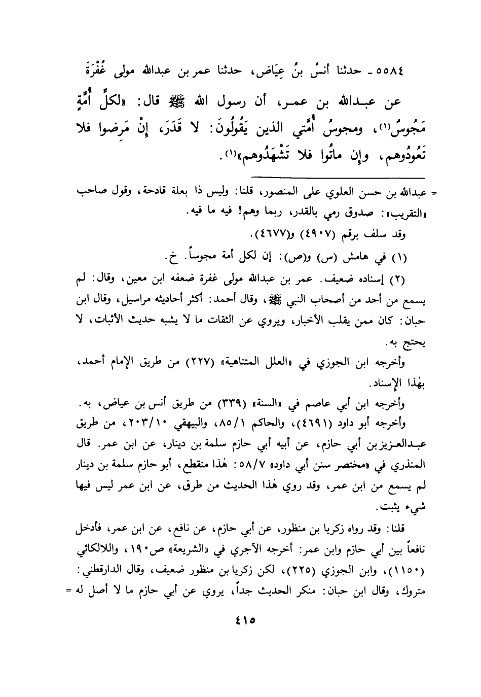 ٥٥٨٤ - حَدَّثَنَا أَنَسُ بْنُ عِيَاضٍ، حَدَّثَنَا عُمَرُ بْنُ عَبْدِ اللهِ مَوْلَى غُفْرَةَ، عَنْ عَبْدِ اللهِ بْنِ عُمَرَ، أَنَّ رَسُولَ اللهِ صَلَّى اللهُ عَلَيْهِ وَسَلَّمَ قَالَ: " لِكُلِّ أُمَّةٍ مَجُوسٌ، ومَجُوسُ (١) أُمَّتِي الَّذِينَ يَقُولُونَ: لَا قَدَرَ، إِنْ مَرِضُوا فَلَا تَعُودُوهُمْ، وَإِنْ مَاتُوا فَلَا تَشْهَدُوهُمْ " (٢)