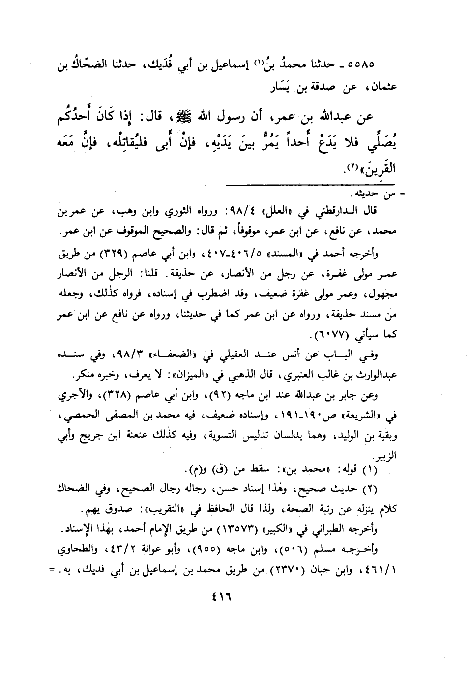 ٥٥٨٥ - حَدَّثَنَا مُحَمَّدُ بْنُ (١) إِسْمَاعِيلَ بْنِ أَبِي فُدَيْكٍ، حَدَّثَنَا الضَّحَّاكُ بْنُ عُثْمَانَ، عَنْ صَدَقَةَ بْنِ يَسَارٍ، عَنْ عَبْدِ اللهِ بْنِ عُمَرَ، أَنَّ رَسُولَ اللهِ صَلَّى اللهُ عَلَيْهِ وَسَلَّمَ قَالَ: " إِذَا كَانَ أَحَدُكُمْ يُصَلِّي فَلَا يَدَعْ أَحَدًا يَمُرُّ بَيْنَ يَدَيْهِ، فَإِنْ أَبَى فَلْيُقَاتِلْهُ، فَإِنَّ مَعَهُ الْقَرِينَ " (٢)