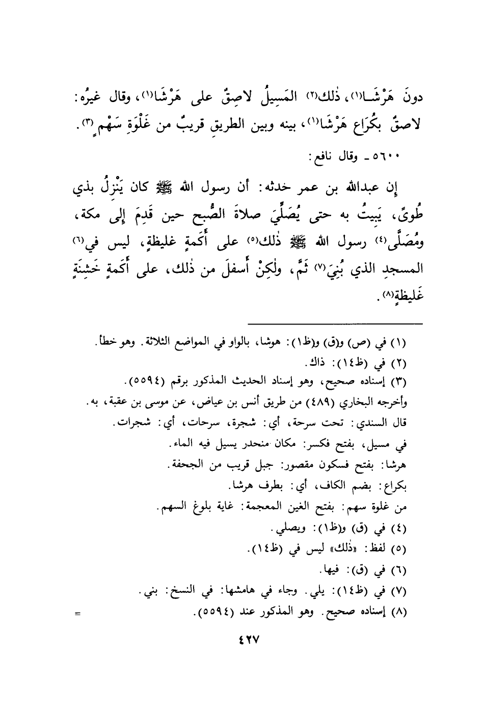 ٥٦٠٠ - وَقَالَ نَافِعٌ: إِنَّ عَبْدَ اللهِ بْنَ عُمَرَ حَدَّثَهُ، " أَنَّ رَسُولَ اللهِ صَلَّى اللهُ عَلَيْهِ وَسَلَّمَ كَانَ يَنْزِلُ بِذِي طُوًى يَبِيتُ بِهِ حَتَّى يُصَلِّيَ صَلَاةَ الصُّبْحِ، حِينَ قَدِمَ إِلَى مَكَّةَ، وَمُصَلَّى (٤) رَسُولِ اللهِ صَلَّى اللهُ عَلَيْهِ وَسَلَّمَ ذَلِكَ (٥) عَلَى أَكَمَةٍ غَلِيظَةٍ، لَيْسَ فِي (٦) الْمَسْجِدِ الَّذِي بُنِيَ (٧) ثَمَّ، وَلَكِنْ أَسْفَلَ مِنْ ذَلِكَ، عَلَى أَكَمَةٍ خَشِنَةٍ غَلِيظَةٍ " (٨)
