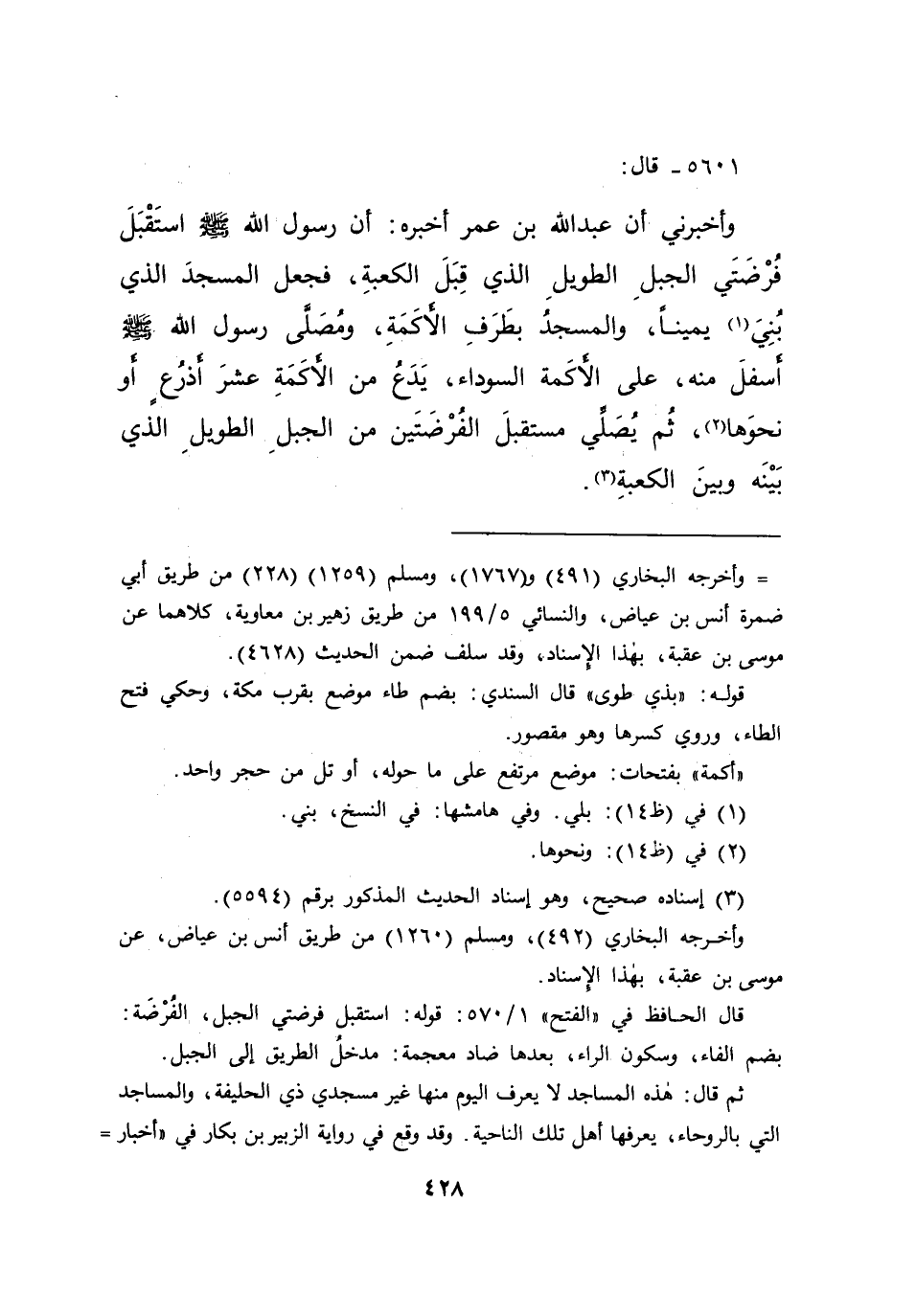 ٥٦٠١ - قَالَ: وَأَخْبَرَنِي أَنَّ عَبْدَ اللهِ بْنَ عُمَرَ أَخْبَرَهُ، " أَنَّ رَسُولَ اللهِ صَلَّى اللهُ عَلَيْهِ وَسَلَّمَ اسْتَقْبَلَ فُرْضَتَيِ الْجَبَلِ الطَّوِيلِ الَّذِي قِبَلَ الْكَعْبَةِ، فَجَعَلَ الْمَسْجِدَ الَّذِي بُنِيَ (١) يَمِينًا، وَالْمَسْجِدُ بِطَرَفِ الْأَكَمَةِ، وَمُصَلَّى رَسُولِ اللهِ صَلَّى اللهُ عَلَيْهِ وَسَلَّمَ أَسْفَلُ مِنْهُ، عَلَى الْأَكَمَةِ السَّوْدَاءِ، يَدَعُ مِنَ الْأَكَمَةِ عَشْرَ أَذْرُعٍ أَوْ نَحْوَهَا، (٢) ثُمَّ يُصَلِّي مُسْتَقْبِلَ الْفُرْضَتَيْنِ مِنَ الْجَبَلِ الطَّوِيلِ الَّذِي بَيْنَهُ وَبَيْنَ الْكَعْبَةِ " (٣)