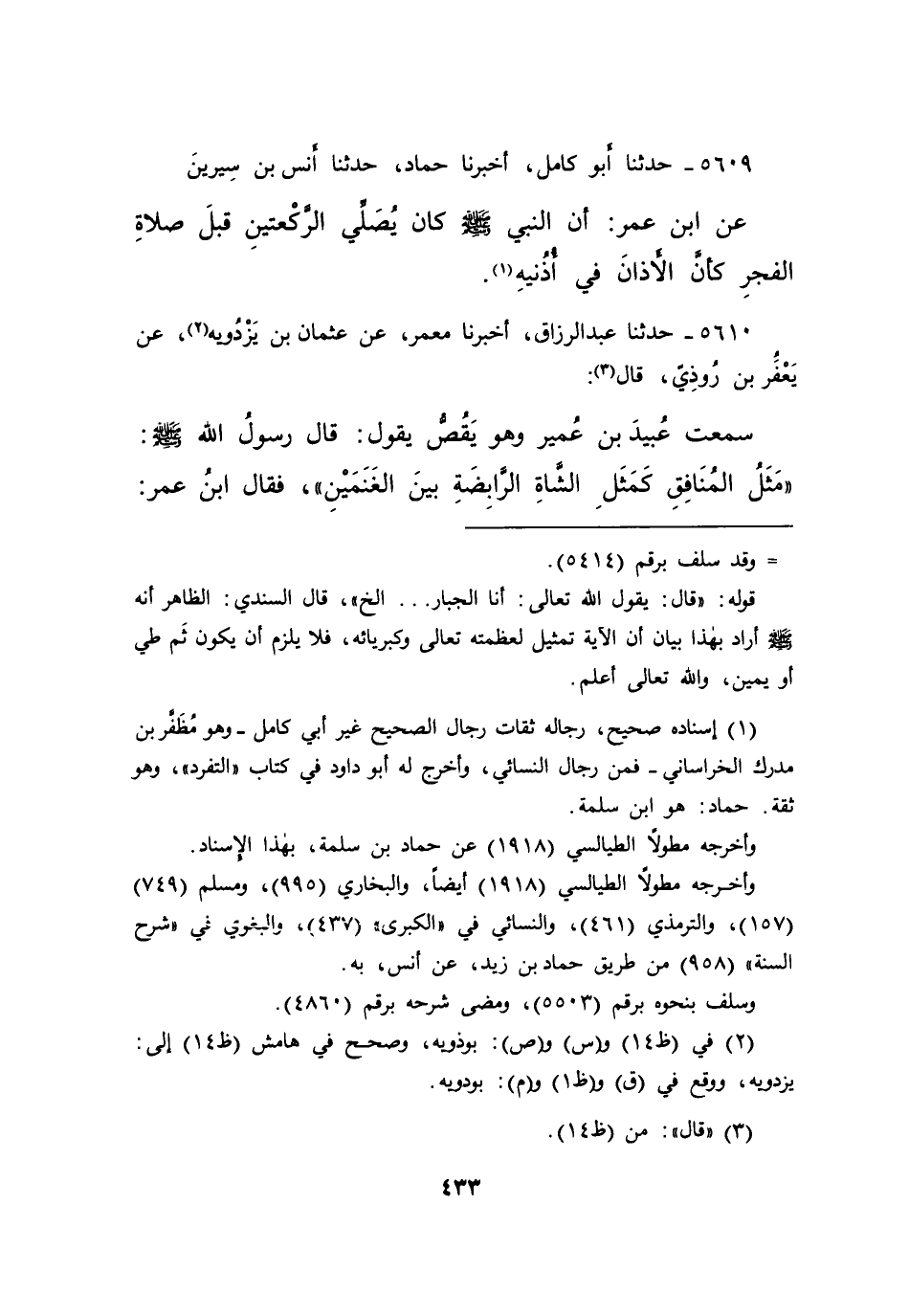 ٥٦٠٩ - حَدَّثَنَا أَبُو كَامِلٍ، أَخْبَرَنَا حَمَّادٌ، حَدَّثَنَا أَنَسُ بْنُ سِيرِينَ، عَنِ ابْنِ عُمَرَ، " أَنَّ النَّبِيَّ صَلَّى اللهُ عَلَيْهِ وَسَلَّمَ كَانَ يُصَلِّي الرَّكْعَتَيْنِ قَبْلَ صَلَاةِ الْفَجْرِ، كَأَنَّ الْأَذَانَ فِي أُذُنَيْهِ " (١)