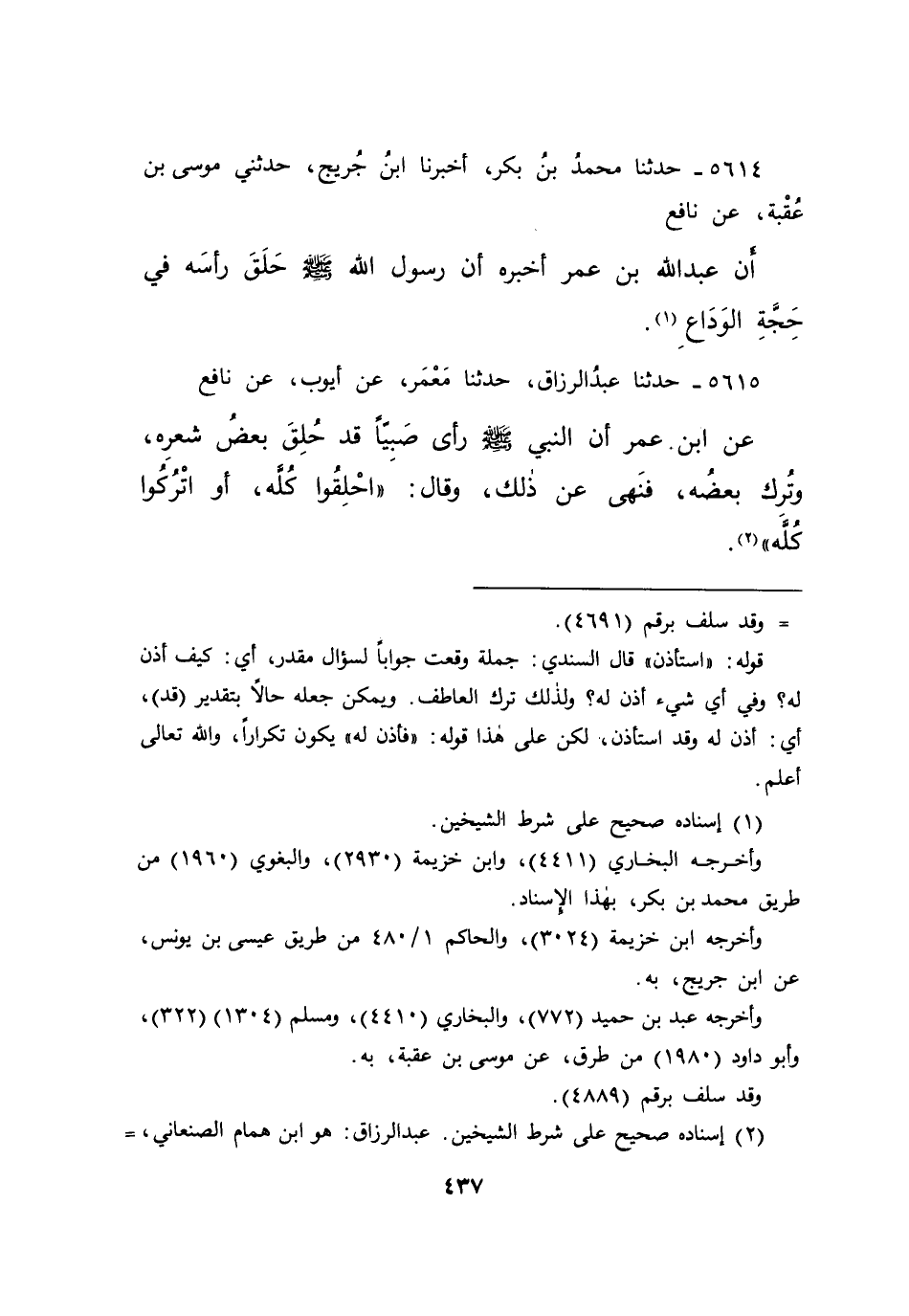 ٥٦١٤ - حَدَّثَنَا مُحَمَّدُ بْنُ بَكْرٍ، أَخْبَرَنَا ابْنُ جُرَيْجٍ، حَدَّثَنِي مُوسَى بْنُ عُقْبَةَ، عَنْ نَافِعٍ، أَنَّ عَبْدَ اللهِ بْنَ عُمَرَ أَخْبَرَهُ، " أَنَّ رَسُولَ اللهِ صَلَّى اللهُ عَلَيْهِ وَسَلَّمَ حَلَقَ رَأْسَهُ فِي حَجَّةِ الْوَدَاعِ " (١)