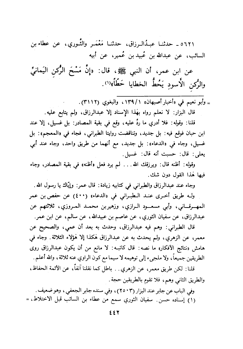 ٥٦٢١ - حَدَّثَنَا عَبْدُ الرَّزَّاقِ، حَدَّثَنَا مَعْمَرٌ، وَالثَّوْرِيُّ، عَنْ عَطَاءِ بْنِ السَّائِبِ، عَنْ عَبْدِ اللهِ بْنِ عُبَيْدِ بْنِ عُمَيْرٍ، عَنْ أَبِيهِ، عَنِ ابْنِ عُمَرَ، أَنَّ النَّبِيَّ صَلَّى اللهُ عَلَيْهِ وَسَلَّمَ قَالَ: " إِنَّ مَسْحَ الرُّكْنِ الْيَمَانِي وَالرُّكْنِ الْأَسْوَدِ يَحُطُّ الْخَطَايَا حَطًّا " (١)