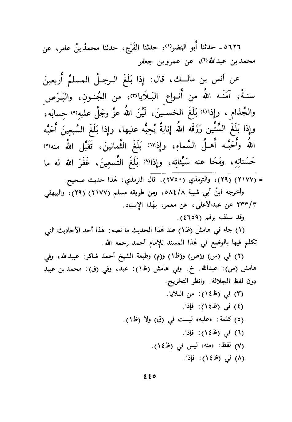 ٥٦٢٦ - حَدَّثَنَا أَبُو النَّضْرِ، (١) حَدَّثَنَا الْفَرَجُ، حَدَّثَنَا مُحَمَّدُ بْنُ عَامِرٍ، عَنْ مُحَمَّدِ بْنِ عَبْدِ اللهِ (٢) ، عَنْ جَعْفَرِ بْنِ عَمْرٍو، عَنْ أَنَسِ بْنِ مَالِكٍ قَالَ: " إِذَا بَلَغَ الرَّجُلُ الْمُسْلِمُ أَرْبَعِينَ سَنَةً، آمَنَهُ اللهُ مِنْ أَنْوَاعِ الْبَلَايَا: (٣) مِنَ الْجُنُونِ، وَالْبَرَصِ، وَالْجُذَامِ. وَإِذَا (٤) بَلَغَ الْخَمْسِينَ لَيَّنَ اللهُ عَزَّ وَجَلَّ عَلَيْهِ (٥) حِسَابَهُ، وَإِذَا بَلَغَ السِّتِّينَ، رَزَقَهُ اللهُ إِنَابَةً يُحِبُّهُ عَلَيْهَا، وَإِذَا بَلَغَ السَّبْعِينَ، أَحَبَّهُ اللهُ وَأَحَبَّهُ أَهْلُ السَّمَاءِ، وَإِذَا (٦) بَلَغَ الثَّمَانِينَ، تَقَبَّلَ اللهُ مِنْهُ (٧) حَسَنَاتِهِ وَمَحَا عَنْهُ سَيِّئَاتِهِ، وَإِذَا (٨) بَلَغَ التِّسْعِينَ، غَفَرَ اللهُ لَهُ مَا