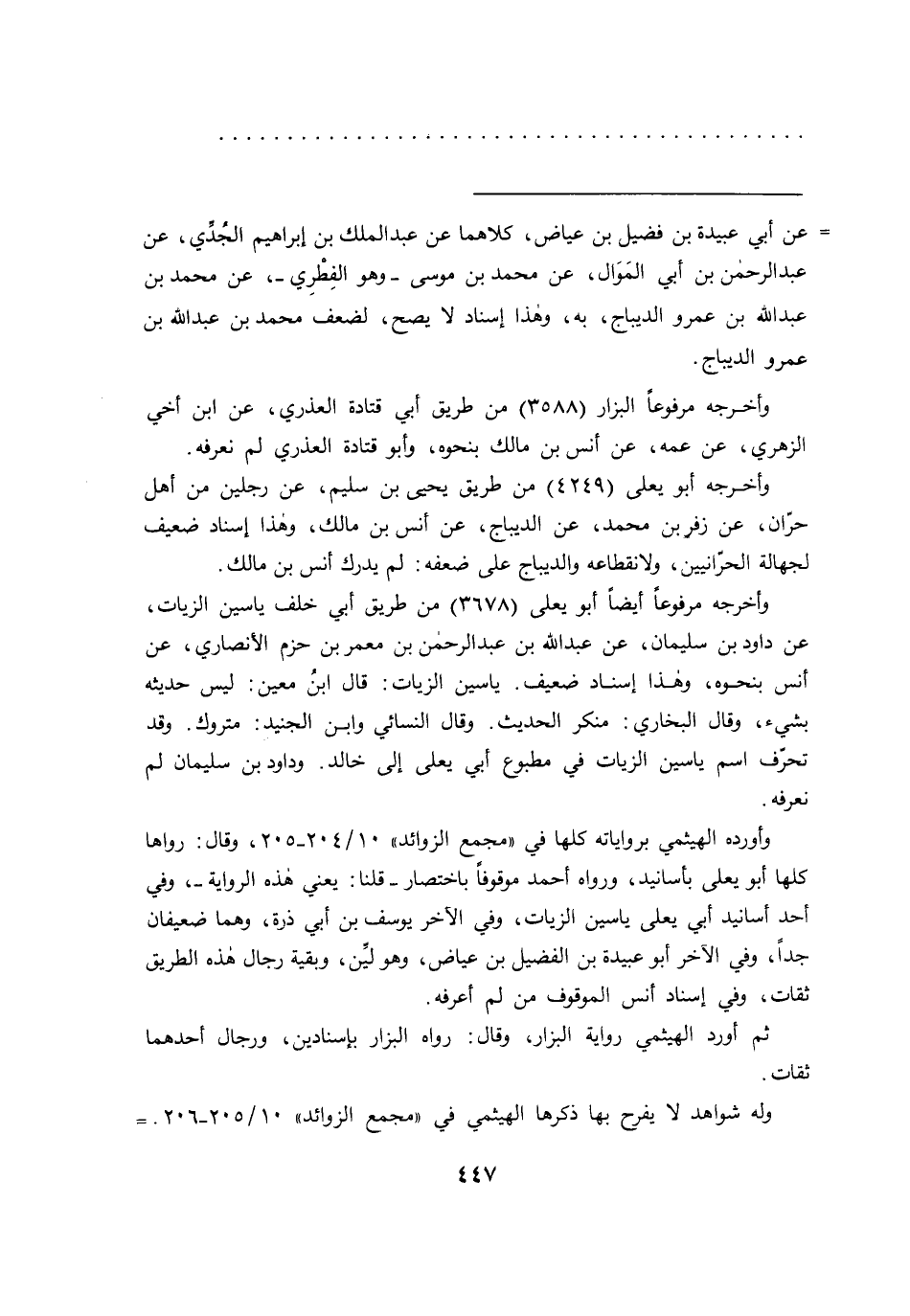 وأورده الهيثمي برواياته كلها في "مجمع الزوائد"، ١٠/٢٠٤-٢٠٥، وقال: رواها كلها أبو يعلى بأسانيد، ورواه أحمد موقوفاً باختصار- قلنا: يعني هذه الرواية -، وفي أحد أسانيد أبي يعلى ياسين الزيات، وفي الآخر يوسف بن أبي ذرة، وهما ضعيفان جداً، وفي الَاخر أبو عبيدة بن الفضيل بن عياض، وهو لين، وبقية رجال هذه الطريق ثقات، وفي إسناد أنس الموقوف من لم أعرفه.