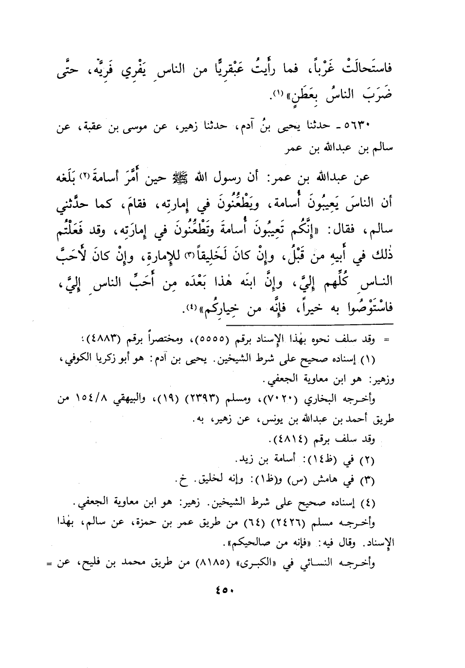 ٥٦٣٠ - حَدَّثَنَا يَحْيَى بْنُ آدَمَ، حَدَّثَنَا زُهَيْرٌ، عَنْ مُوسَى بْنِ عُقْبَةَ، عَنْ سَالِمِ بْنِ عَبْدِ اللهِ بْنِ عُمَرَ، عَنْ عَبْدِ اللهِ بْنِ عُمَرَ، أَنَّ رَسُولَ اللهِ صَلَّى اللهُ عَلَيْهِ وَسَلَّمَ حِينَ أَمَّرَ أُسَامَةَ (٢) بَلَغَهُ أَنَّ النَّاسَ يَعِيبُونَ أُسَامَةَ وَيَطْعَنُونَ فِي إِمَارَتِهِ، فَقَامَ - كَمَا حَدَّثَنِي سَالِمٌ - فَقَالَ: " إِنَّكُمْ تَعِيبُونَ أُسَامَةَ وَتَطْعَنُونَ فِي إِمَارَتِهِ، وَقَدْ فَعَلْتُمْ ذَلِكَ فِي أَبِيهِ مِنْ قَبْلُ، وَإِنْ كَانَ لَخَلِيقًا (٣) لِلْإِمَارَةِ، وَإِنْ كَانَ لَأَحَبَّ النَّاسِ كُلِّهِمْ إِلَيَّ وَإِنَّ ابْنَهُ هَذَا بَعْدَهُ مِنْ أَحَبِّ النَّاسِ إِلَيَّ فَاسْتَوْصُوا بِهِ خَيْرًا فَإِنَّهُ مِنْ خِيَارِكُمْ " (٤)