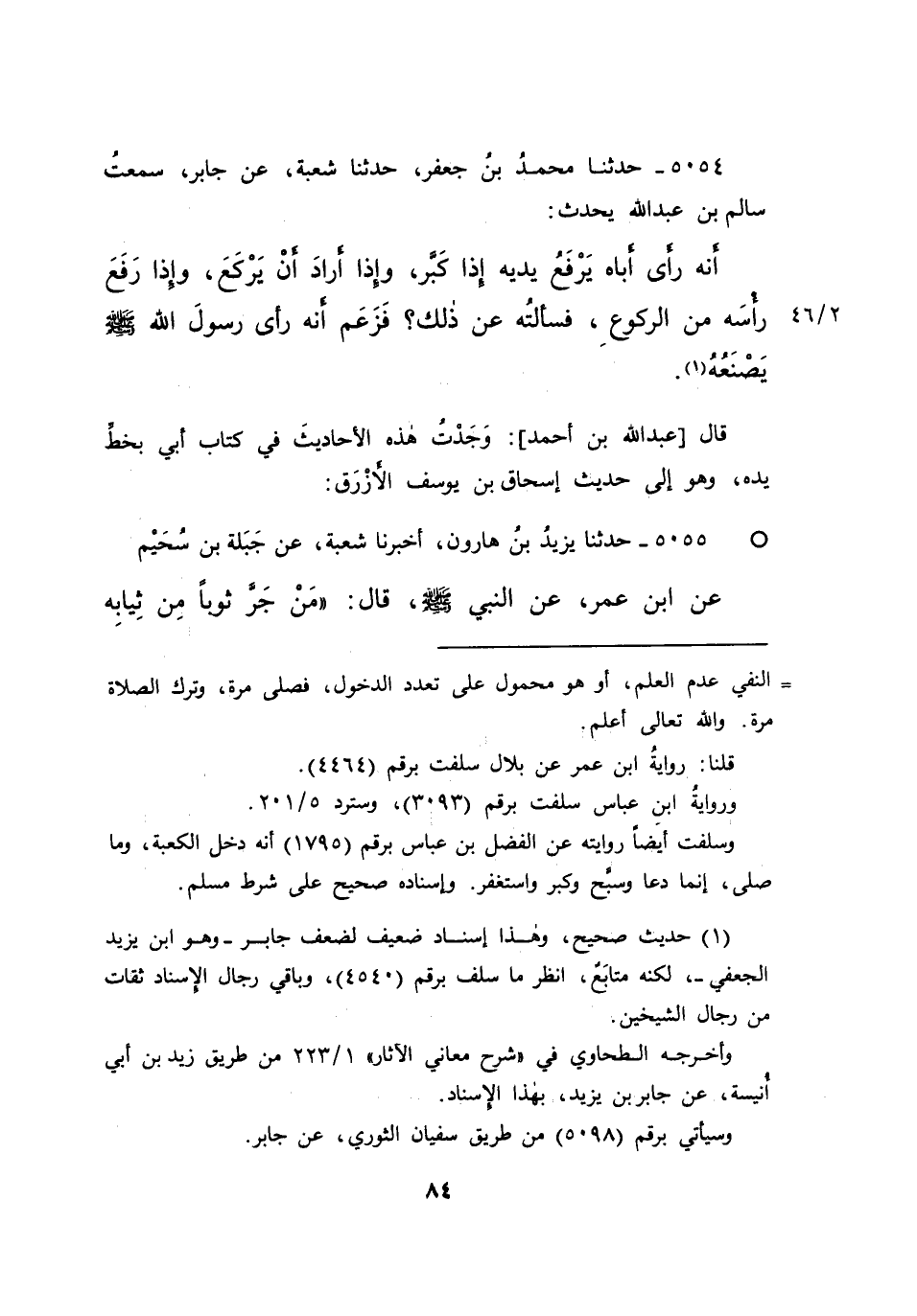 ° ٥٠٥٥ - حَدَّثَنَا يَزِيدُ بْنُ هَارُونَ، أَخْبَرَنَا شُعْبَةُ، عَنْ جَبَلَةَ بْنِ سُحَيْمٍ، عَنِ ابْنِ عُمَرَ، عَنِ النَّبِيِّ صَلَّى اللهُ عَلَيْهِ وَسَلَّمَ قَالَ: " مَنْ جَرَّ ثَوْبًا مِنْ ثِيَابِهِ