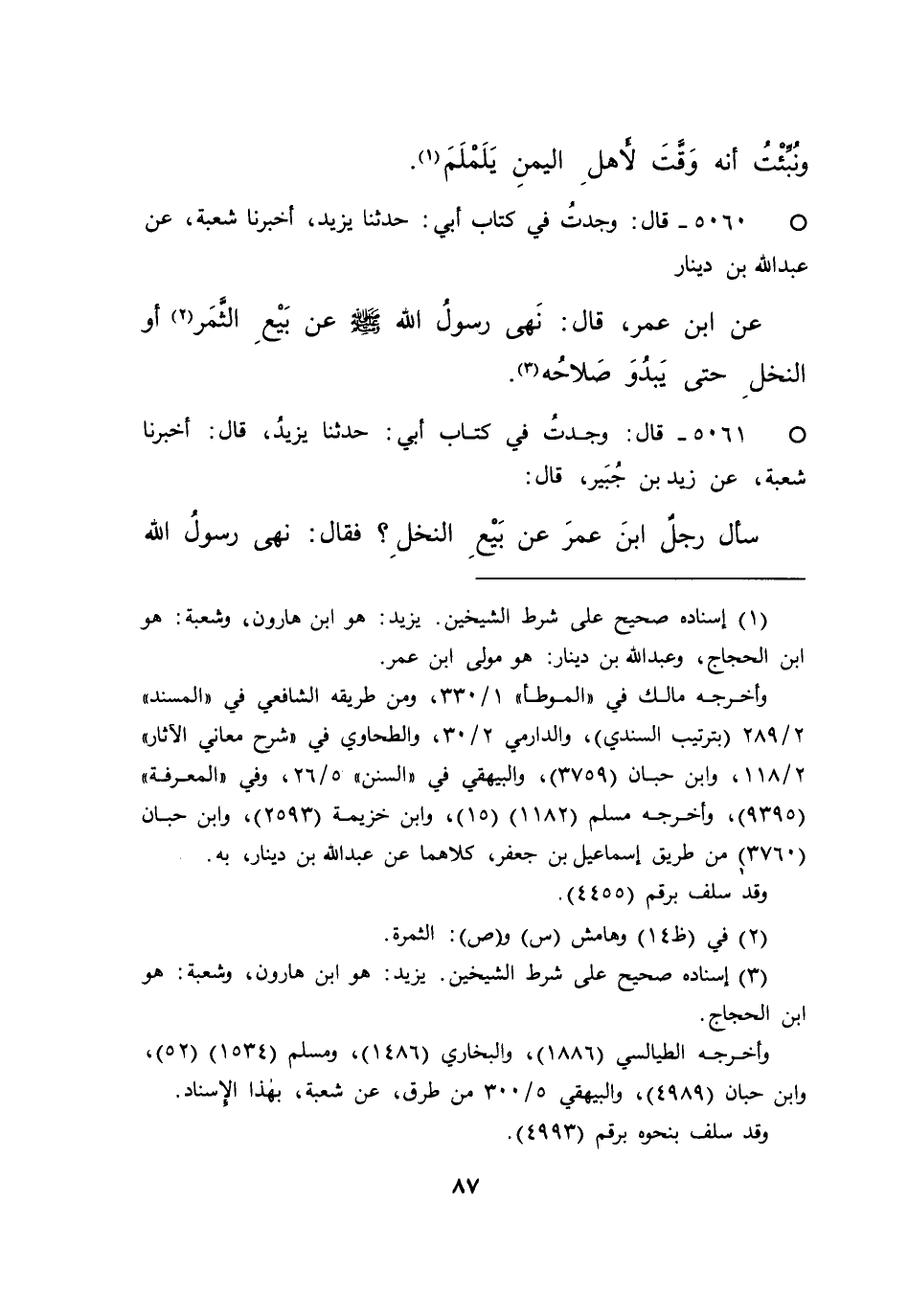 ° ٥٠٦١ - قَالَ: وَجَدْتُ فِي كِتَابِ أَبِي، حَدَّثَنَا يَزِيدُ قَالَ: أَخْبَرَنَا شُعْبَةُ، عَنْ زَيْدِ بْنِ جُبَيْرٍ قَالَ: سَأَلَ رَجُلٌ ابْنَ عُمَرَ عَنْ بَيْعِ النَّخْلِ، فَقَالَ: " نَهَى رَسُولُ اللهِ صَلَّى اللهُ عَلَيْهِ وَسَلَّمَ