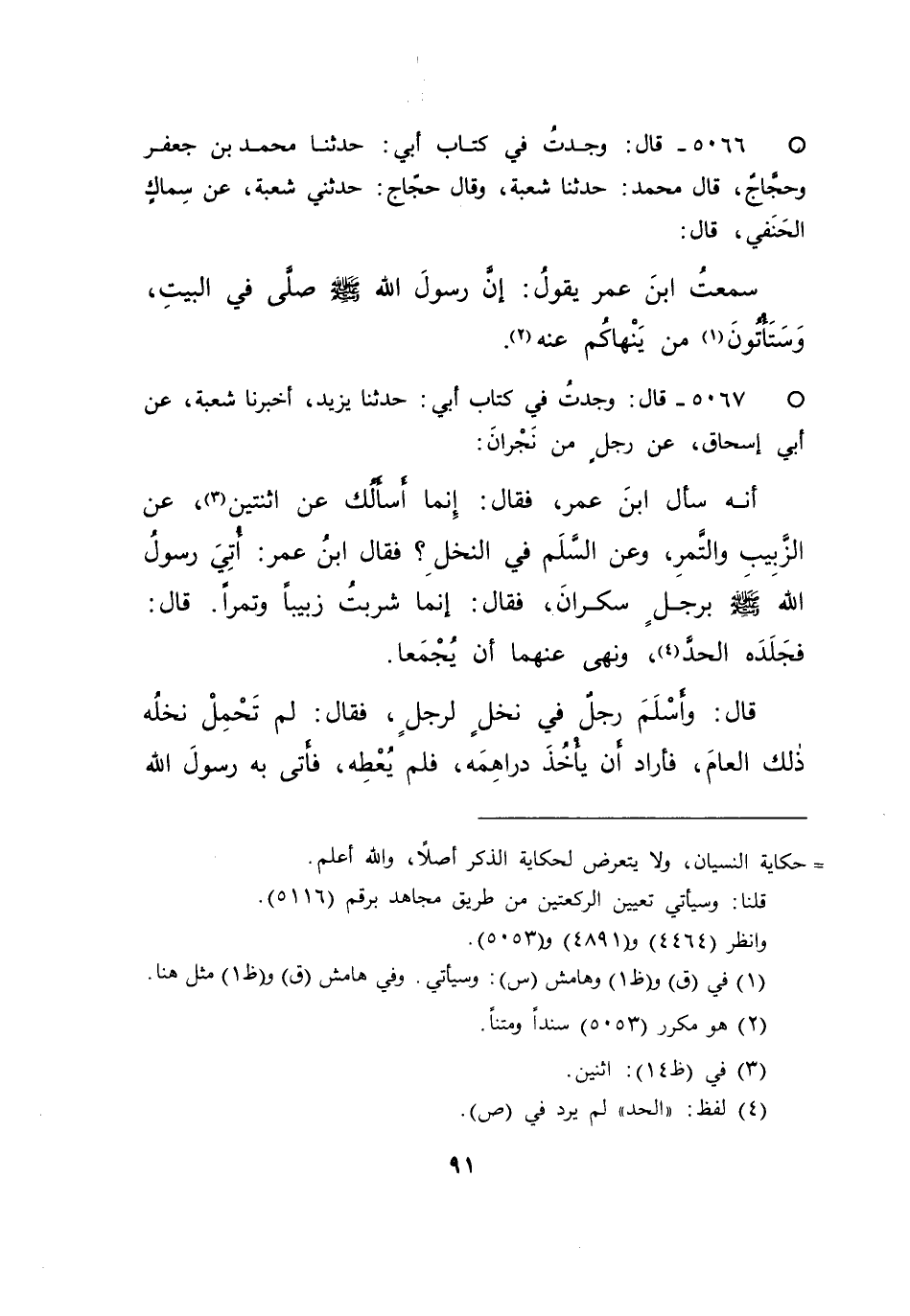 ° ٥٠٦٧ - قَالَ: وَجَدْتُ فِي كِتَابِ أَبِي، حَدَّثَنَا يَزِيدُ، أَخْبَرَنَا شُعْبَةُ، عَنْ أَبِي إِسْحَاقَ، عَنْ رَجُلٍ مِنْ نَجْرَانَ، أَنَّهُ سَأَلَ ابْنَ عُمَرَ فَقَالَ: إِنَّمَا أَسْأَلُكَ عَنِ اثْنَتَيْنِ: (٣) عَنِ الزَّبِيبِ وَالتَّمْرِ، وَعَنِ السَّلَمِ فِي النَّخْلِ، فَقَالَ ابْنُ عُمَرَ: أُتِيَ رَسُولُ اللهِ صَلَّى اللهُ عَلَيْهِ وَسَلَّمَ بِرَجُلٍ سَكْرَانَ، فَقَالَ: إِنَّمَا شَرِبْتُ زَبِيبًا وَتَمْرًا، قَالَ: فَجَلَدَهُ الْحَدَّ، (٤) وَنَهَى عَنْهُمَا أَنْ يُجْمَعَا. قَالَ: وَأَسْلَمَ رَجُلٌ فِي نَخْلٍ لِرَجُلٍ، فَقَالَ: لَمْ تَحْمِلْ نَخْلُهُ ذَلِكَ الْعَامَ، فَأَرَادَ أَنْ يَأْخُذَ دَرَاهِمَهُ، فَلَمْ يُعْطِهِ، فَأَتَى بِهِ رَسُولَ اللهِ صَلَّى اللهُ عَلَيْهِ وَسَلَّمَ