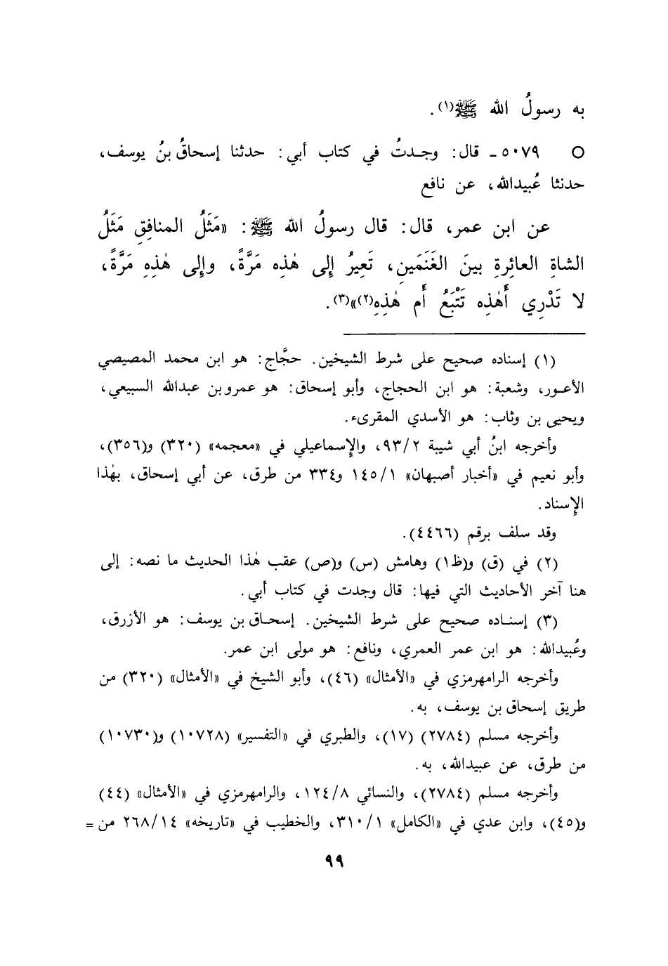 ° ٥٠٧٩ - قَالَ: وَجَدْتُ فِي كِتَابِ أَبِي، حَدَّثَنَا إِسْحَاقُ بْنُ يُوسُفَ، حَدَّثَنَا عُبَيْدُ اللهِ، عَنْ نَافِعٍ، عَنِ ابْنِ عُمَرَ قَالَ: قَالَ رَسُولُ اللهِ صَلَّى اللهُ عَلَيْهِ وَسَلَّمَ: " مَثَلُ الْمُنَافِقِ كَمَثَلِ الشَّاةِ الْعَائِرَةِ بَيْنَ الْغَنَمَيْنِ تَعِيرُ إِلَى هَذِهِ مَرَّةً، وَإِلَى هَذِهِ مَرَّةً، لَا تَدْرِي أَهَذِهِ تَتْبَعُ، أَمْ هَذِهِ (٢) " (٣)
