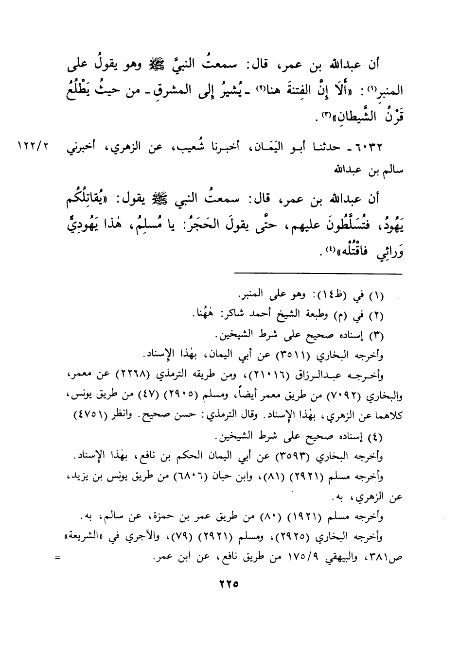 ٦٠٣٢ - حَدَّثَنَا أَبُو الْيَمَانِ، أَخْبَرَنَا شُعَيْبٌ، عَنِ الزُّهْرِيِّ، أَخْبَرَنِي سَالِمُ بْنُ عَبْدِ اللهِ، أَنَّ عَبْدَ اللهِ بْنَ عُمَرَ قَالَ: سَمِعْتُ النَّبِيَّ صَلَّى اللهُ عَلَيْهِ وَسَلَّمَ يَقُولُ: " يُقَاتِلُكُمْ يَهُودُ فَتُسَلَّطُونَ عَلَيْهِمْ حَتَّى يَقُولَ الْحَجَرُ: يَا مُسْلِمُ هَذَا يَهُودِيٌّ وَرَائِي فَاقْتُلْهُ " (٤)