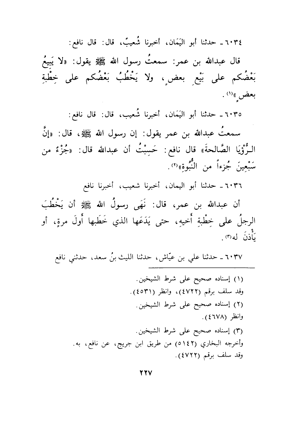 ٦٠٣٤ - حَدَّثَنَا أَبُو الْيَمَانِ، أَخْبَرَنَا شُعَيْبٌ قَالَ: قَالَ نَافِعٌ: قَالَ: عَبْدُ اللهِ بْنُ عُمَرَ، سَمِعْتُ رَسُولَ اللهِ صَلَّى اللهُ عَلَيْهِ وَسَلَّمَ يَقُولُ: " لَا يَبِيعُ بَعْضُكُمْ عَلَى بَيْعِ بَعْضٍ، وَلَا يَخْطُبُ بَعْضُكُمْ عَلَى خِطْبَةِ بَعْضٍ " (١)