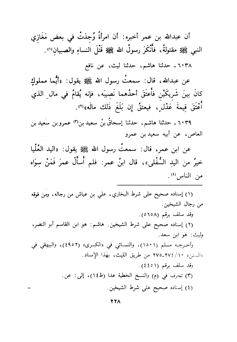 (٢) إسناده صحيح على شرط الشيخين. هاشم: هو ابن القاسم أبو النضر، وليث: هو ابن سعد.