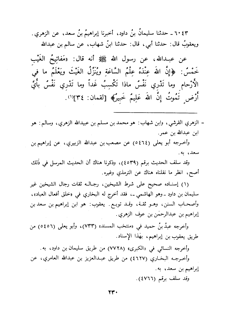 ٦٠٤٣ - حَدَّثَنَا سُلَيْمَانُ بْنُ دَاوُدَ، أَخْبَرَنَا إِبْرَاهِيمُ بْنُ سَعْدٍ، عَنِ الزُّهْرِيِّ، وَيَعْقُوبُ قَالَ: حَدَّثَنَا أَبِي قَالَ: حَدَّثَنَا ابْنُ شِهَابٍ، عَنْ سَالِمِ بْنِ عَبْدِ اللهِ، عَنْ عَبْدِ اللهِ، عَنْ رَسُولِ اللهِ صَلَّى اللهُ عَلَيْهِ وَسَلَّمَ أَنَّهُ قَالَ: " مَفَاتِيحُ الْغَيْبِ خَمْسٌ ": {إِنَّ اللهَ عِنْدَهُ عِلْمُ السَّاعَةِ وَيُنَزِّلُ الْغَيْثَ وَيَعْلَمُ مَا فِي الْأَرْحَامِ وَمَا تَدْرِي نَفْسٌ مَاذَا تَكْسِبُ غَدًا وَمَا تَدْرِي نَفْسٌ بِأَيِّ أَرْضٍ تَمُوتُ، إِنَّ اللهَ عَلِيمٌ خَبِيرٌ} [لقمان: ٣٤] (١)