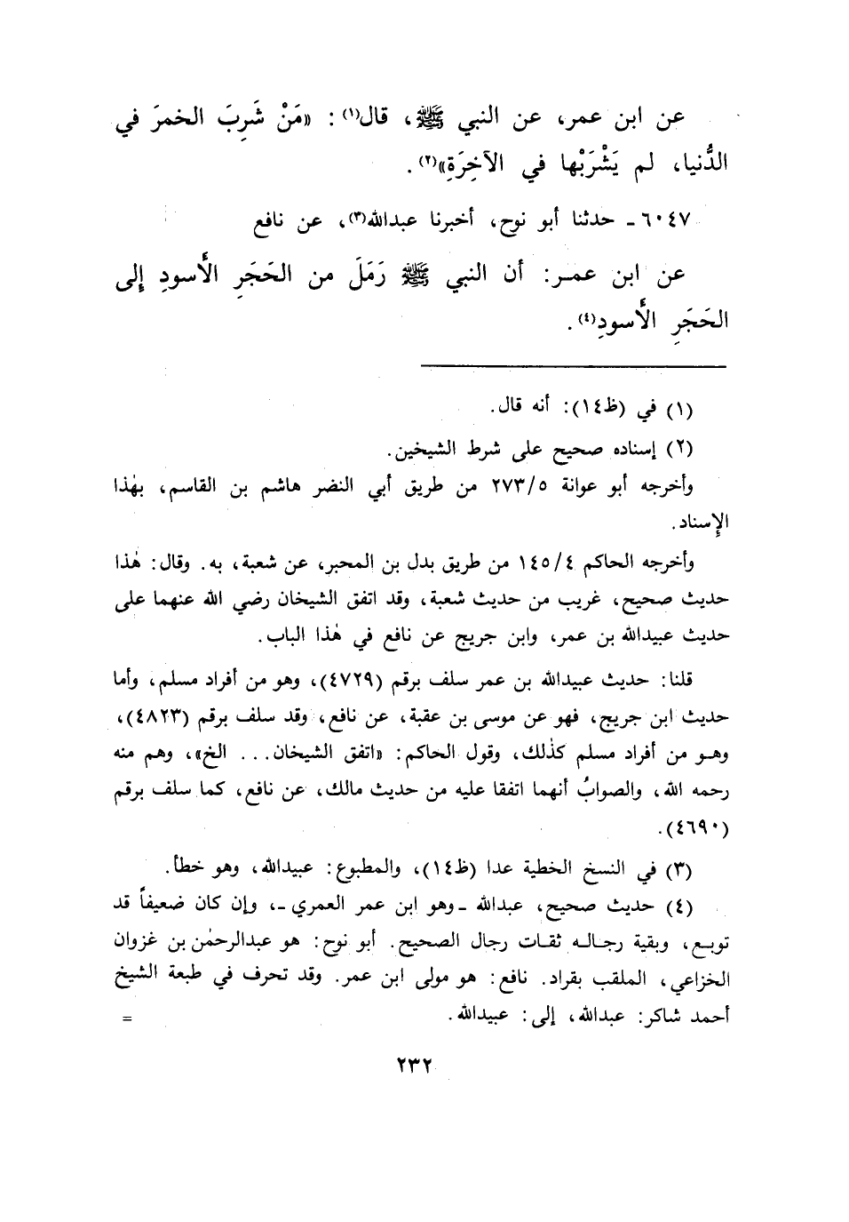 (٤) حديث صحيح، عبد الله- وهو ابن عمر العمري-، وإن كان ضعيفاً قد توبع، وبقية رجاله ثقات رجال الصحيح. أبو نوح: هو عبد الرحمن بن غزوان الخزاعي، الملقب بقراد. نافع: هو مولى ابن عمر. وقد تحرف في طبعة الشيخ أحمد شاكر: عبد الله، إلى: عبيد الله.=