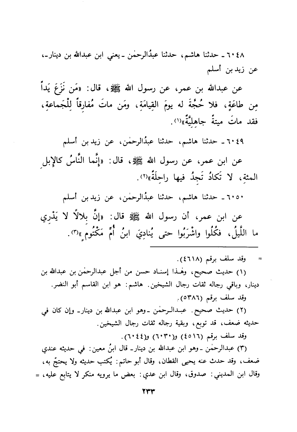 ٦٠٤٨ - حَدَّثَنَا هَاشِمٌ، حَدَّثَنَا عَبْدُ الرَّحْمَنِ يَعْنِي ابْنَ عَبْدِ اللهِ بْنِ دِينَارٍ، عَنْ زَيْدِ بْنِ أَسْلَمَ، عَنْ عَبْدِ اللهِ بْنِ عُمَرَ، عَنْ رَسُولِ اللهِ صَلَّى اللهُ عَلَيْهِ وَسَلَّمَ قَالَ: " مَنْ نَزَعَ يَدًا مِنْ طَاعَةٍ، فَلَا حُجَّةَ لَهُ يَوْمَ الْقِيَامَةِ، وَمَنْ مَاتَ مُفَارِقًا لِلْجَمَاعَةِ، فَقَدْ مَاتَ مِيتَةً جَاهِلِيَّةً " (١)