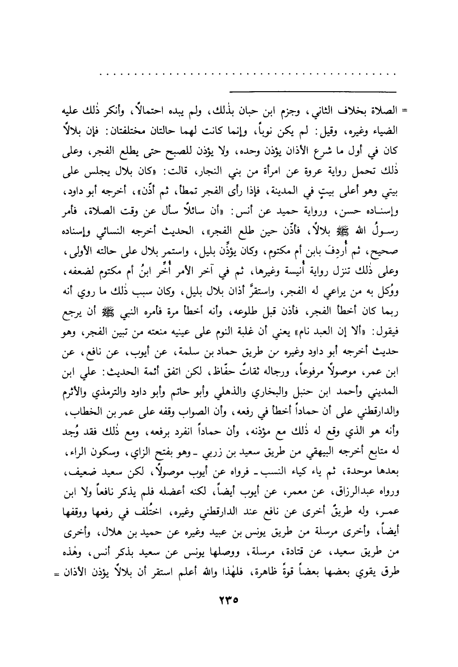 المديني وأحمد ابن حنبل والبخاري والذهلي وأبو حاتم وأبو داود والترمذي والآثرم والدارقطني على أن حماداً أخطأ في رفعه، وأن الصواب وقفه على عمر بن الخطاب، وأنه هو الذي وقع له ذلك مع مؤذنه، وأن حماداً انفرد برفعه، ومع ذلك فقد وُجد له متابع أخرجه البيهقي من طريق سعيد بن زربي- وهو بفتح الزاي، وسكون الراء، بعدها موحدة، ثم ياء كياء النسب-فرواه عن أيوب موصولًا،لكن سعيد ضعيف، ورواه عبد الرزاق، عن معمر، عن أيوب أيضاً، لكنه أعضله فلم يذكر نافعاً ولا ابن عمر، وله طريقٌ أخرى عن نافع عند الدارقطني وغيره، اختُلف في رفعها ووقفها أيضاً، وأخرى مرسلة من طريق يونس بن عبيد وغيره عن حميد بن هلال، وأخرى من طريق سعيد، عن قتادة، مرسلة، ووصلها يونس عن سعيد بذكر أنس، وهذه طرق يقوي بعضها بعضاً قوةً ظاهرة، فلهذا والله أعلم استقر أن بلالاً يؤذن الآذان=