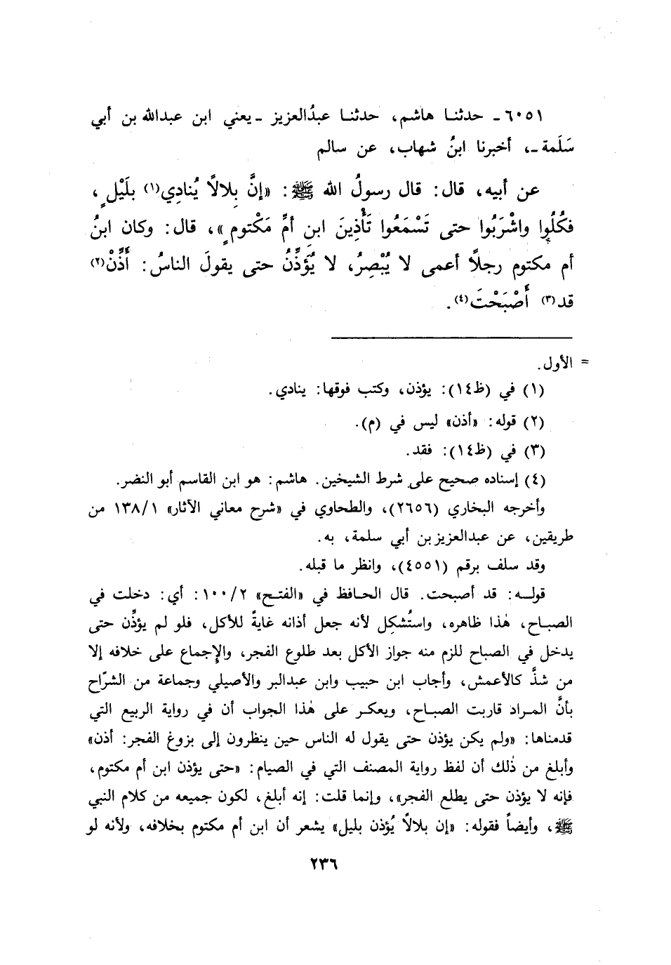 ٦٠٥١ - حَدَّثَنَا هَاشِمٌ، حَدَّثَنَا عَبْدُ الْعَزِيزِ يَعْنِي ابْنَ عَبْدِ اللهِ بْنِ أَبِي سَلَمَةَ، أَخْبَرَنَا ابْنُ شِهَابٍ، عَنْ سَالِمٍ، عَنْ أَبِيهِ قَالَ: قَالَ رَسُولُ اللهِ صَلَّى اللهُ عَلَيْهِ وَسَلَّمَ: " إِنَّ بِلَالًا يُنَادِي (١) بِلَيْلٍ، فَكُلُوا وَاشْرَبُوا حَتَّى تَسْمَعُوا تَأْذِينَ ابْنِ أُمِّ مَكْتُومٍ " قَالَ: " وَكَانَ ابْنُ أُمِّ مَكْتُومٍ رَجُلًا أَعْمَى لَا يُبْصِرُ لَا يُؤَذِّنُ حَتَّى يَقُولَ النَّاسُ: أَذِّنْ (٢) قَدْ (٣) أَصْبَحْتَ " (٤)