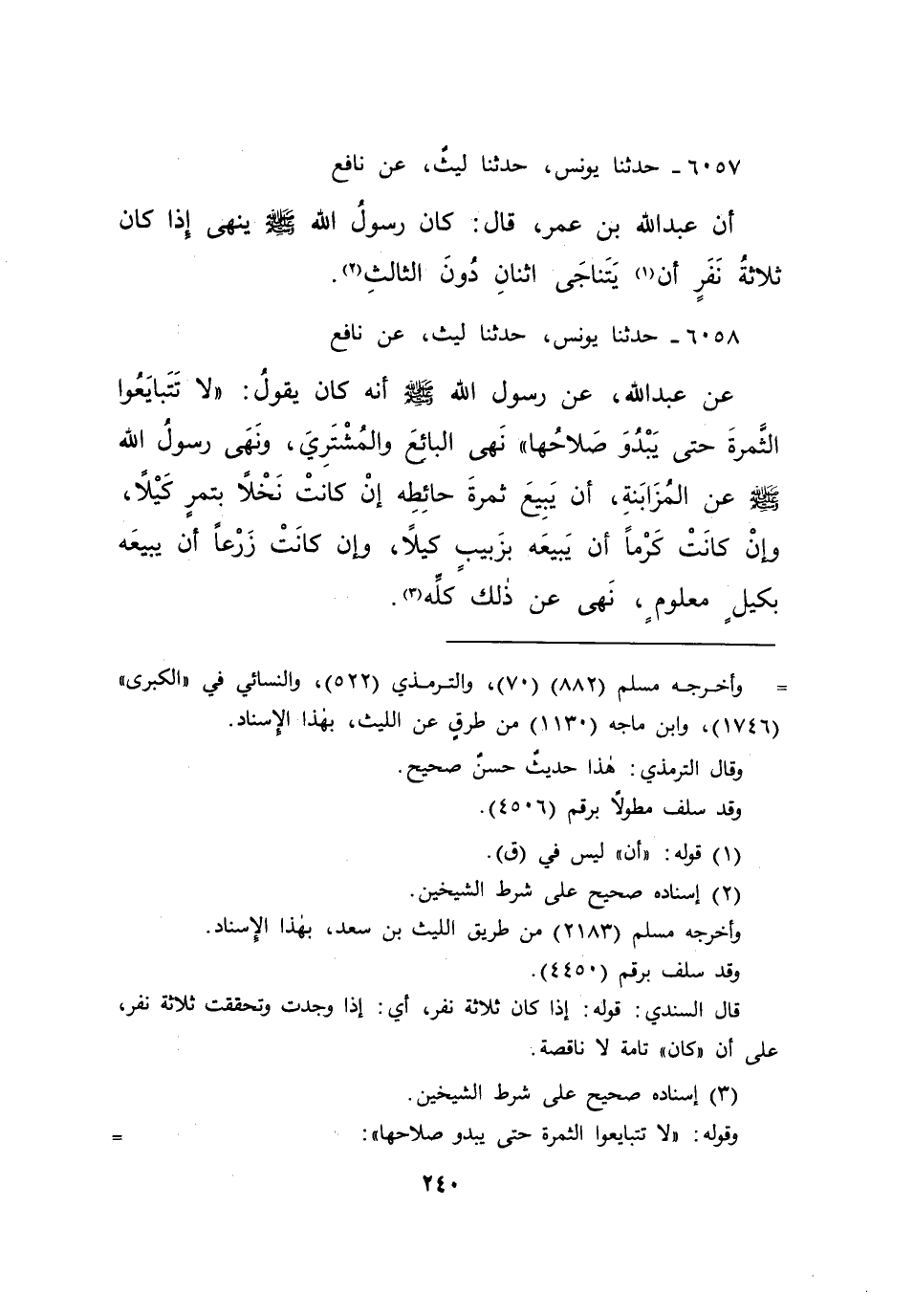 ٦٠٥٨ - حَدَّثَنَا يُونُسُ، حَدَّثَنَا لَيْثٌ، عَنْ نَافِعٍ، عَنْ عَبْدِ اللهِ، عَنْ رَسُولِ اللهِ صَلَّى اللهُ عَلَيْهِ وَسَلَّمَ أَنَّهُ كَانَ يَقُولُ: " لَا تَتَبَايَعُوا الثَّمَرَةَ حَتَّى يَبْدُوَ صَلَاحُهَا "، نَهَى الْبَائِعَ وَالْمُشْتَرِيَ، وَنَهَى رَسُولُ اللهِ صَلَّى اللهُ عَلَيْهِ وَسَلَّمَ عَنِ الْمُزَابَنَةِ، أَنْ يَبِيعَ ثَمَرَةَ حَائِطِهِ إِنْ كَانَتْ نَخْلًا بِتَمْرٍ كَيْلًا، وَإِنْ كَانَتْ كَرْمًا أَنْ يَبِيعَهُ بِزَبِيبٍ كَيْلًا، وَإِنْ كَانَتْ زَرْعًا أَنْ يَبِيعَهُ بِكَيْلٍ مَعْلُومٍ، نَهَى عَنْ ذَلِكَ كُلِّهِ (٣)