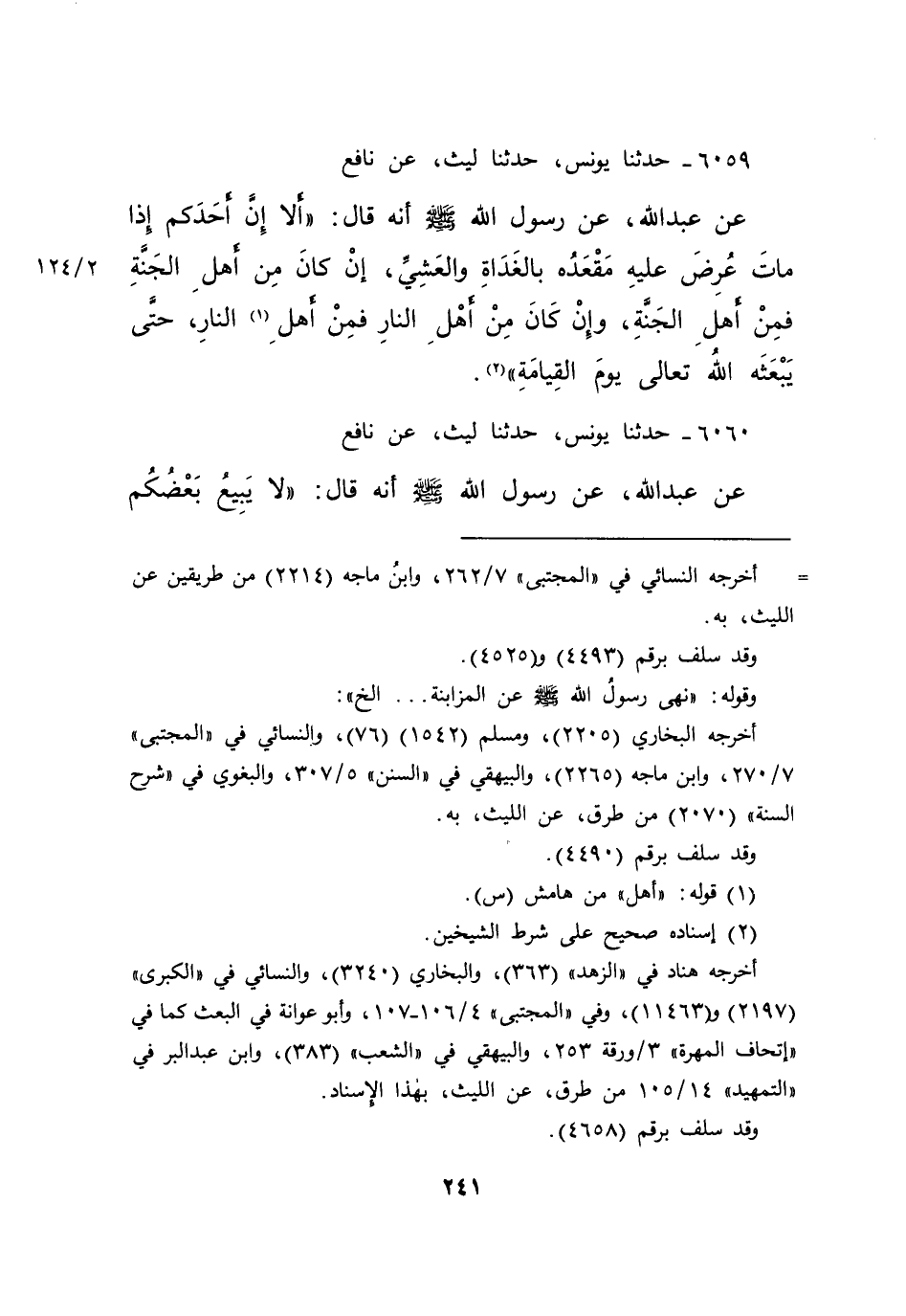 ٦٠٦٠ - حَدَّثَنَا يُونُسُ، حَدَّثَنَا لَيْثٌ، عَنْ نَافِعٍ، عَنْ عَبْدِ اللهِ، عَنْ رَسُولِ اللهِ صَلَّى اللهُ عَلَيْهِ وَسَلَّمَ أَنَّهُ قَالَ: " لَا يَبِيعُ بَعْضُكُمْ