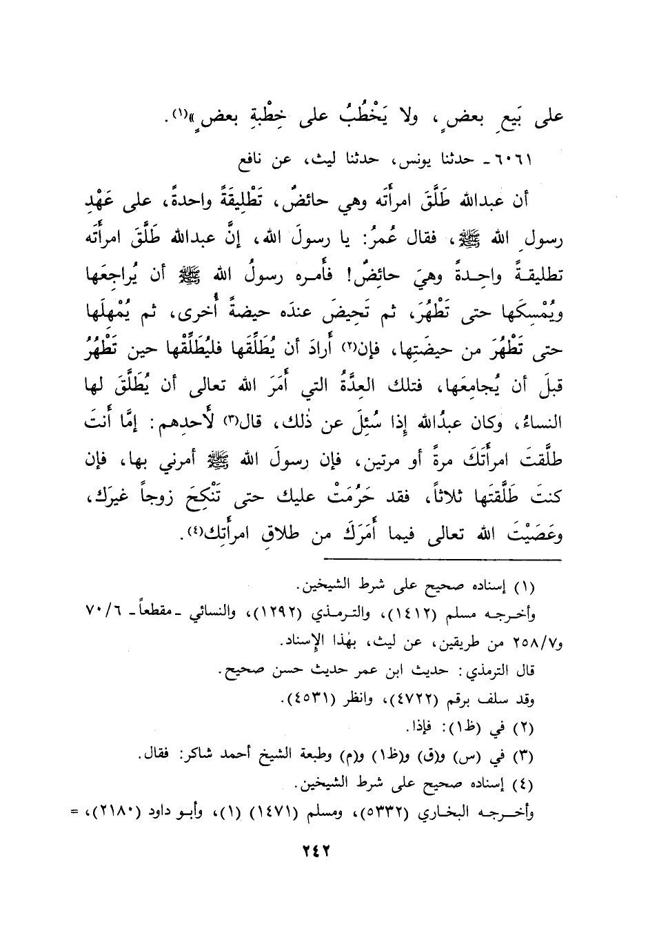 ٦٠٦١ - حَدَّثَنَا يُونُسُ، حَدَّثَنَا لَيْثٌ، عَنْ نَافِعٍ، أَنَّ عَبْدَ اللهِ طَلَّقَ امْرَأَتَهُ، وَهِيَ حَائِضٌ تَطْلِيقَةً وَاحِدَةً عَلَى عَهْدِ رَسُولِ اللهِ صَلَّى اللهُ عَلَيْهِ وَسَلَّمَ، فَقَالَ عُمَرُ: يَا رَسُولَ اللهِ، إِنَّ عَبْدَ اللهِ طَلَّقَ امْرَأَتَهُ تَطْلِيقَةً وَاحِدَةً وَهِيَ حَائِضٌ، " فَأَمَرَهُ رَسُولُ اللهِ صَلَّى اللهُ عَلَيْهِ وَسَلَّمَ أَنْ يُرَاجِعَهَا، وَيُمْسِكَهَا حَتَّى تَطْهُرَ، ثُمَّ تَحِيضَ عِنْدَهُ حَيْضَةً أُخْرَى، ثُمَّ يُمْهِلَهَا حَتَّى تَطْهُرَ مِنْ حَيْضَتِهَا، فَإِنْ (٢) أَرَادَ أَنْ يُطَلِّقَهَا فَلْيُطَلِّقْهَا حِينَ تَطْهُرُ، قَبْلَ أَنْ يُجَامِعَهَا، فَتِلْكَ الْعِدَّةُ الَّتِي أَمَرَ اللهُ تَعَالَى، أَنْ يُطَلَّقَ لَهَا النِّسَاءُ " وَكَانَ عَبْدُ اللهِ إِذَا سُئِلَ عَنْ ذَلِكَ قَالَ (٣) لِأَحَدِهِمْ: أَمَّا أَنْتَ طَلَّقْتَ امْرَأَتَكَ مَرَّةً أَوْ مَرَّتَيْنِ، " فَإِنَّ رَسُولَ اللهِ صَلَّى اللهُ عَلَيْهِ وَسَلَّمَ أَمَرَنِي بِهَا "، فَإِنْ كُنْتَ طَلَّقْتَهَا ثَلَاثًا، فَقَدْ حَرُمَتْ عَلَيْكَ حَتَّى تَنْكِحَ زَوْجًا غَيْرَكَ، وَعَصَيْتَ اللهَ تَعَالَى فِيمَا أَمَرَكَ مِنْ طَلَاقِ امْرَأَتِكَ (٤)