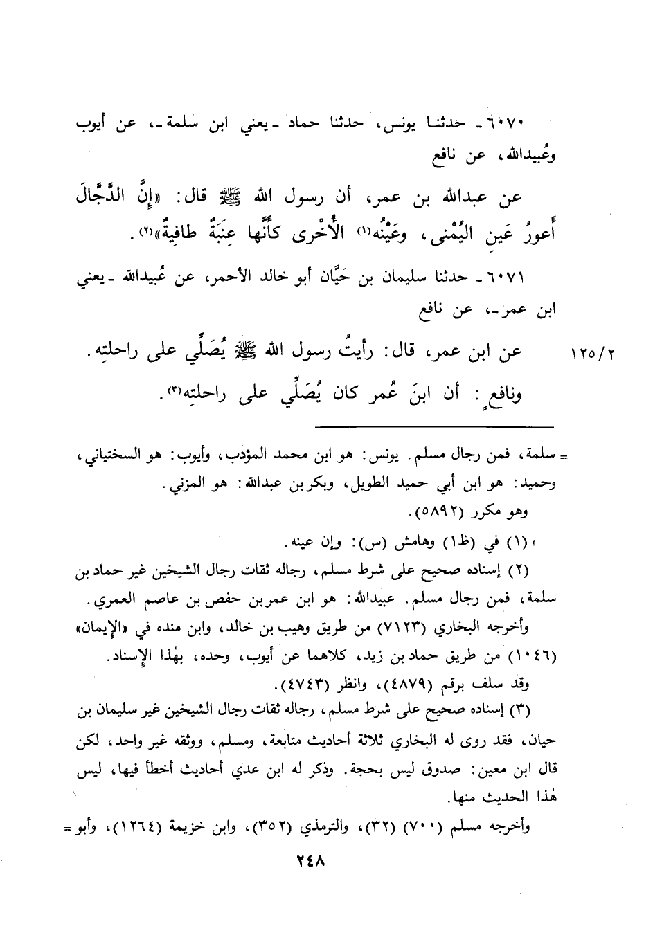 ٦٠٧١ - حَدَّثَنَا سُلَيْمَانُ بْنُ حَيَّانَ أَبُو خَالِدٍ الْأَحْمَرُ، عَنْ عُبَيْدِ اللهِ يَعْنِي ابْنَ عُمَرَ، عَنْ نَافِعٍ، عَنِ ابْنِ عُمَرَ قَالَ: " رَأَيْتُ رَسُولَ اللهِ صَلَّى اللهُ عَلَيْهِ وَسَلَّمَ يُصَلِّي عَلَى رَاحِلَتِهِ "، وَنَافِعٌ، أَنَّ ابْنَ عُمَرَ كَانَ يُصَلِّي عَلَى رَاحِلَتِهِ (٣)