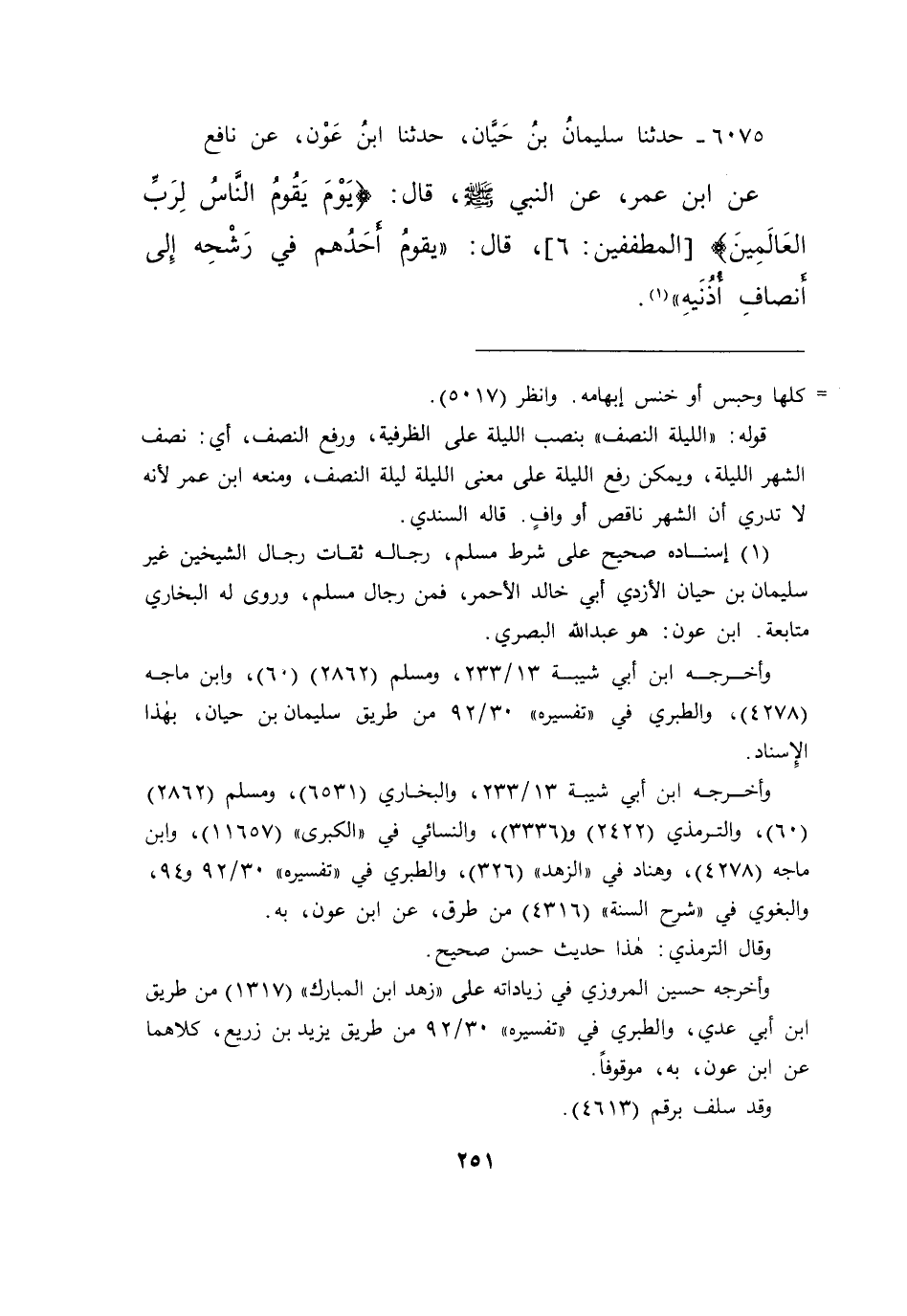 ٦٠٧٥ - حَدَّثَنَا سُلَيْمَانُ بْنُ حَيَّانَ، حَدَّثَنَا ابْنُ عَوْنٍ، عَنْ نَافِعٍ، عَنْ ابْنِ عُمَرَ، عَنِ النَّبِيِّ صَلَّى اللهُ عَلَيْهِ وَسَلَّمَ قَالَ: {يَوْمَ يَقُومُ النَّاسُ لِرَبِّ الْعَالَمِينَ} [المطففين: ٦] قَالَ: " يَقُومُ أَحَدُهُمْ فِي رَشْحِهِ إِلَى أَنْصَافِ أُذُنَيْهِ " (١)