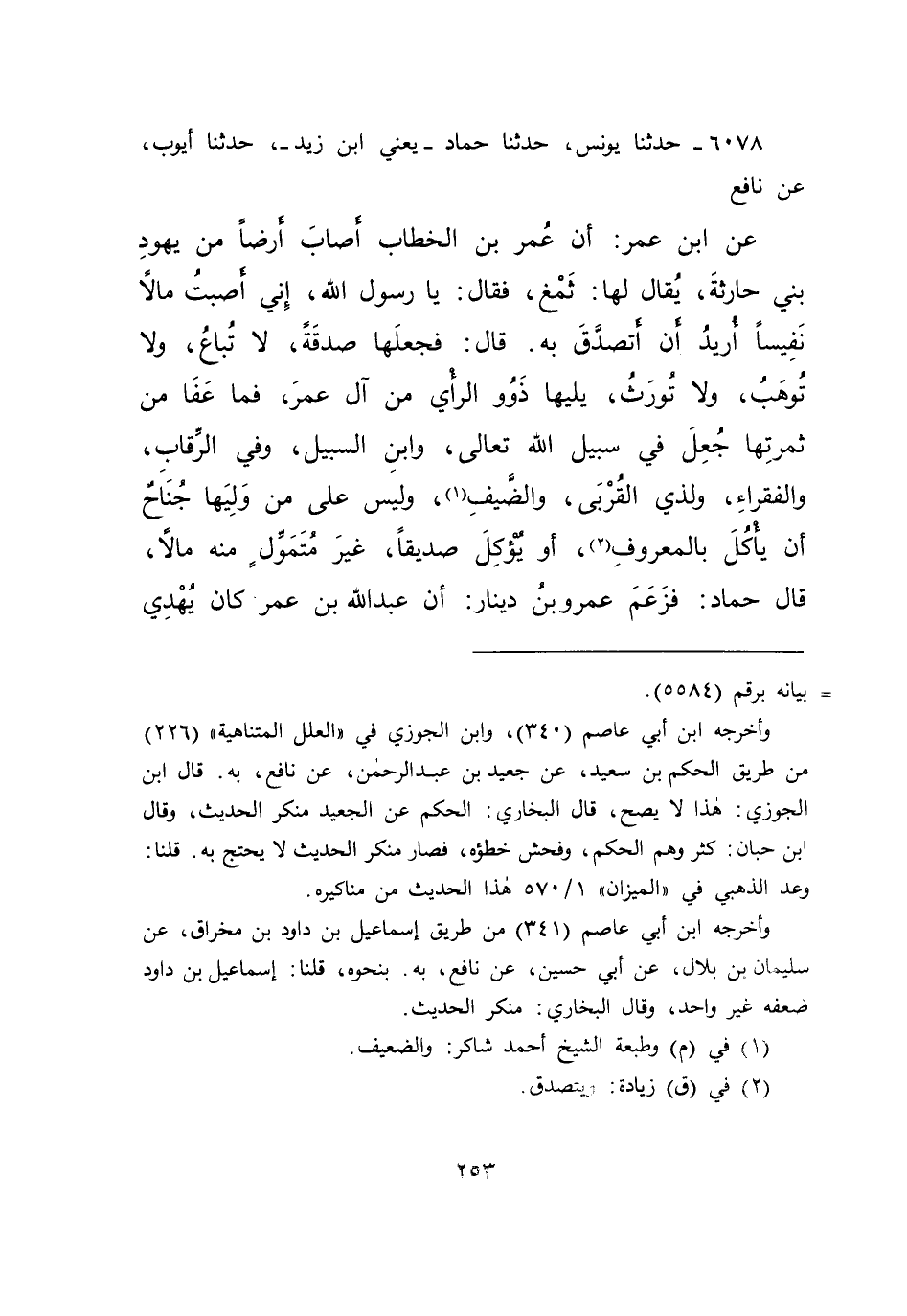 ٦٠٧٨ - حَدَّثَنَا يُونُسُ، حَدَّثَنَا حَمَّادٌ يَعْنِي ابْنَ زَيْدٍ، حَدَّثَنَا أَيُّوبُ، عَنْ نَافِعٍ، عَنِ ابْنِ عُمَرَ، أَنَّ عُمَرَ بْنَ الْخَطَّابِ أَصَابَ أَرْضًا مِنْ يَهُودِ بَنِي حَارِثَةَ يُقَالُ لَهَا: ثَمْغٌ، فَقَالَ: يَا رَسُولَ اللهِ، إِنِّي أَصَبْتُ مَالًا نَفِيسًا، أُرِيدُ أَنْ أَتَصَدَّقَ بِهِ، قَالَ: " فَجَعَلَهَا صَدَقَةً لَا تُبَاعُ، وَلَا تُوهَبُ، وَلَا تُورَثُ، يَلِيهَا ذَوُو الرَّأْيِ مِنْ آلِ عُمَرَ، فَمَا عَفَا مِنْ ثَمَرَتِهَا جُعِلَ فِي سَبِيلِ اللهِ تَعَالَى، وَابْنِ السَّبِيلِ، وَفِي الرِّقَابِ، وَالْفُقَرَاءِ، وَلِذِي الْقُرْبَى، وَالضَّيْفِ (١) ، وَلَيْسَ عَلَى مَنْ وَلِيَهَا جُنَاحٌ أَنْ يَأْكُلَ بِالْمَعْرُوفِ (٢) ، أَوْ يُؤْكِلَ صَدِيقًا غَيْرَ مُتَمَوِّلٍ مِنْهُ مَالًا " قَالَ حَمَّادٌ: فَزَعَمَ عَمْرُو بْنُ دِينَارٍ، أَنَّ عَبْدَ اللهِ بْنَ عُمَرَ كَانَ يُهْدِي