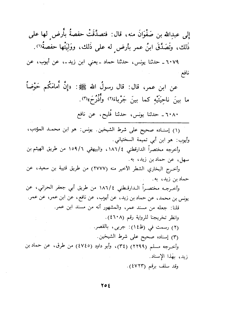 ٦٠٧٩ - حَدَّثَنَا يُونُسُ، حَدَّثَنَا حَمَّادٌ يَعْنِي ابْنَ زَيْدٍ، عَنْ أَيُّوبَ، عَنْ نَافِعٍ، عَنِ ابْنِ عُمَرَ قَالَ: قَالَ رَسُولُ اللهِ صَلَّى اللهُ عَلَيْهِ وَسَلَّمَ: " إِنَّ أَمَامَكُمْ حَوْضًا مَا بَيْنَ نَاحِيَتَيْهِ، كَمَا بَيْنَ جَرْبَاءَ (٢) وَأَذْرُحَ " (٣)
