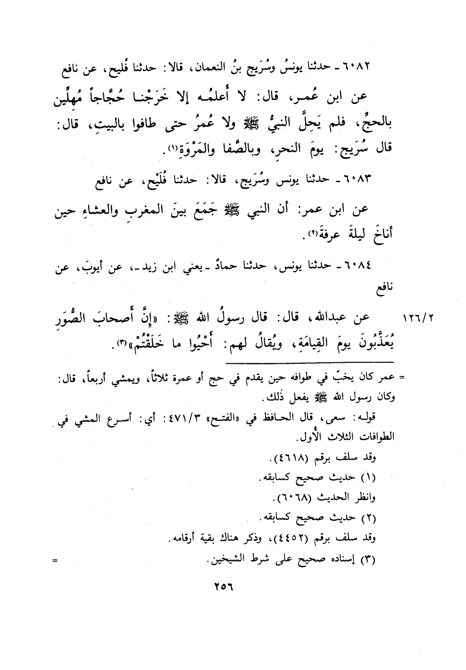 ٦٠٨٢ - حَدَّثَنَا يُونُسُ، وَسُرَيْجُ بْنُ النُّعْمَانِ، قَالَا: حَدَّثَنَا فُلَيْحٌ، عَنْ نَافِعٍ، عَنِ ابْنِ عُمَرَ قَالَ: لَا أَعْلَمُهُ إِلَّا " خَرَجْنَا حُجَّاجًا مُهِلِّينَ بِالْحَجِّ، فَلَمْ يَحِلَّ النَّبِيُّ صَلَّى اللهُ عَلَيْهِ وَسَلَّمَ، وَلَا عُمَرُ حَتَّى طَافُوا بِالْبَيْتِ - قَالَ: قَالَ سُرَيْجٌ يَوْمَ النَّحْرِ - وَبِالصَّفَا وَالْمَرْوَةِ " (١)