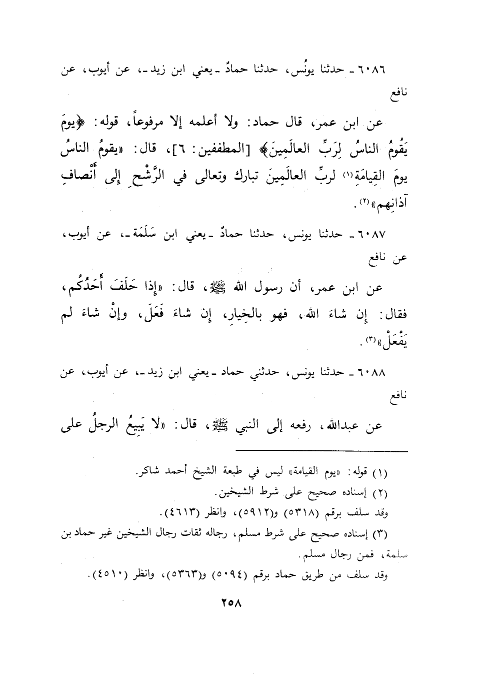 ٦٠٨٧ - حَدَّثَنَا يُونُسُ، حَدَّثَنَا حَمَّادٌ يَعْنِي ابْنَ سَلَمَةَ، عَنْ أَيُّوبَ، عَنْ نَافِعٍ، عَنِ ابْنِ عُمَرَ، أَنَّ رَسُولَ اللهِ صَلَّى اللهُ عَلَيْهِ وَسَلَّمَ قَالَ: " إِذَا حَلَفَ أَحَدُكُمْ فَقَالَ: إِنْ شَاءَ اللهُ فَهُوَ بِالْخِيَارِ: إِنْ شَاءَ فَعَلَ، وَإِنْ شَاءَ لَمْ يَفْعَلْ " (٣)
