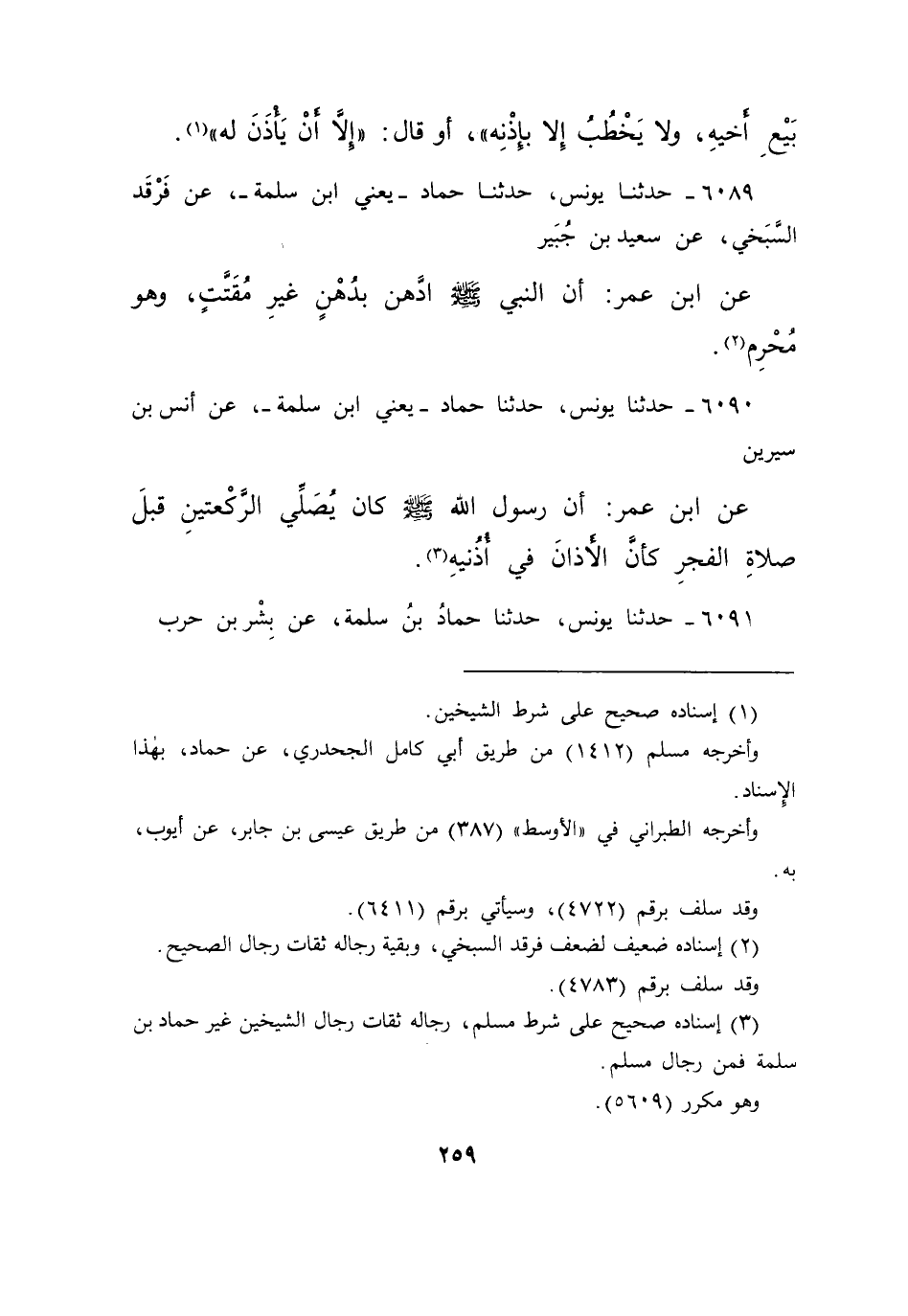 ٦٠٨٩ - حَدَّثَنَا يُونُسُ، حَدَّثَنَا حَمَّادٌ يَعْنِي ابْنَ سَلَمَةَ، عَنْ فَرْقَدٍ السَّبَخِيِّ، عَنْ سَعِيدِ بْنِ جُبَيْرٍ، عَنِ ابْنِ عُمَرَ، " أَنَّ النَّبِيَّ صَلَّى اللهُ عَلَيْهِ وَسَلَّمَ ادَّهَنَ بِدُهْنٍ غَيْرِ مُقَتَّتٍ، وَهُوَ مُحْرِمٌ " (٢)