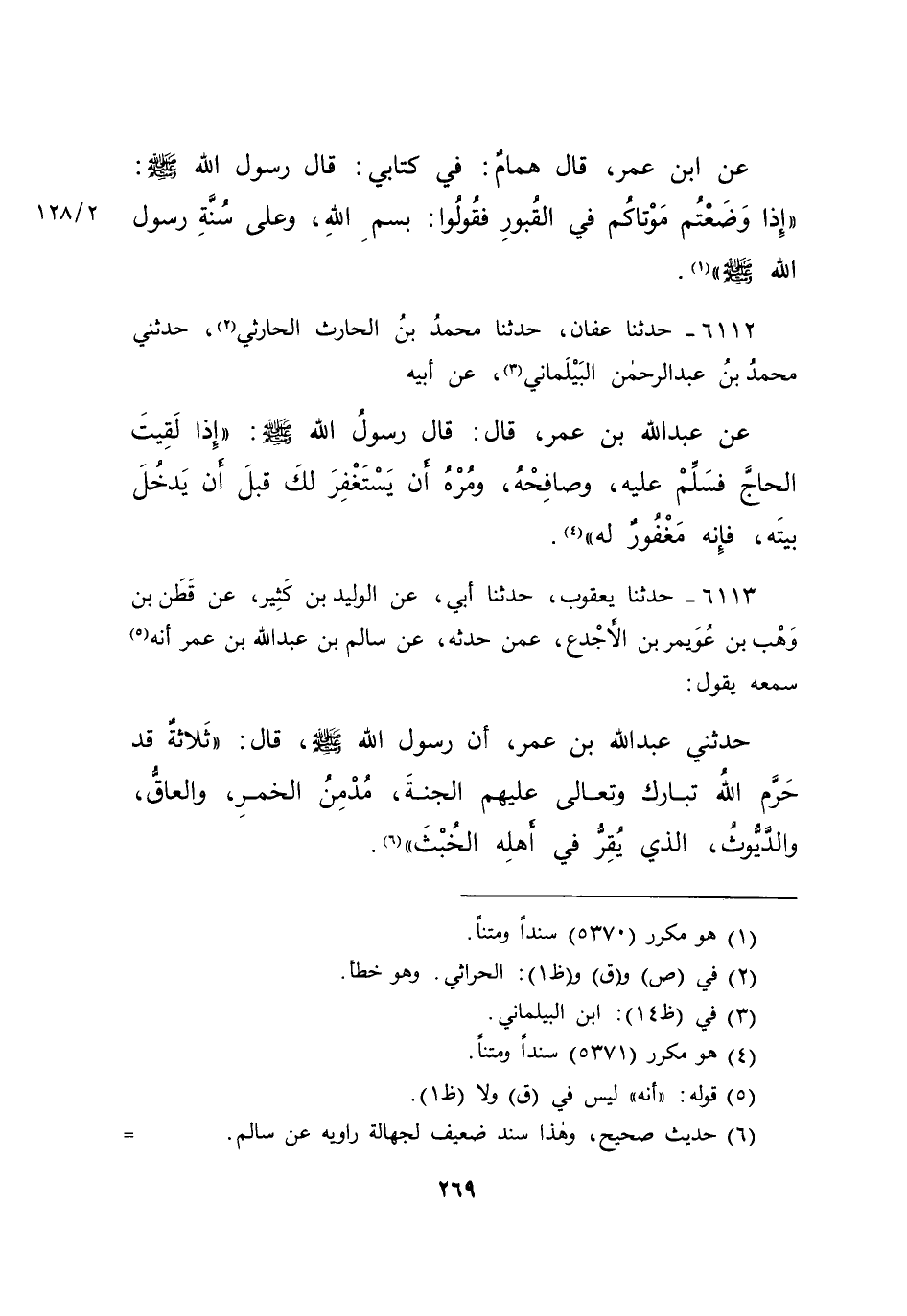 ٦١١٢ - حَدَّثَنَا عَفَّانُ، حَدَّثَنَا مُحَمَّدُ بْنُ الْحَارِثِ الْحَارِثِيُّ (٢) ، حَدَّثَنِي مُحَمَّدُ بْنُ عَبْدِ الرَّحْمَنِ الْبَيْلَمَانِيُّ (٣) ، عَنْ أَبِيهِ، عَنْ عَبْدِ اللهِ بْنِ عُمَرَ قَالَ: قَالَ رَسُولُ اللهِ صَلَّى اللهُ عَلَيْهِ وَسَلَّمَ: " إِذَا لَقِيتَ الْحَاجَّ فَسَلِّمْ عَلَيْهِ، وَصَافِحْهُ، وَمُرْهُ أَنْ يَسْتَغْفِرَ لَكَ قَبْلَ أَنْ يَدْخُلَ بَيْتَهُ، فَإِنَّهُ مَغْفُورٌ لَهُ " (٤)