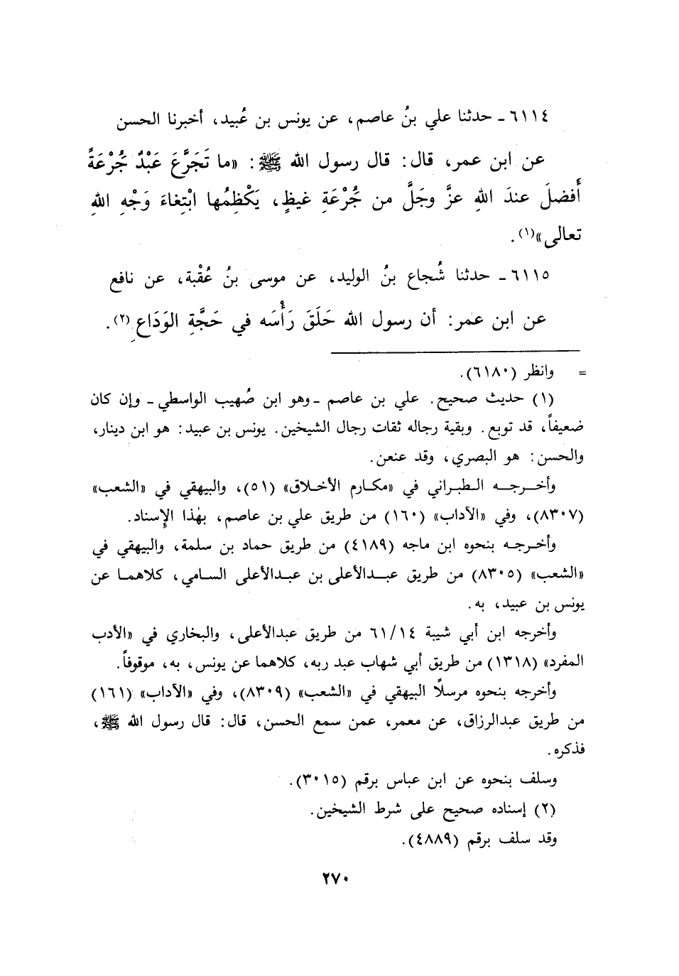 ٦١١٤ - حَدَّثَنَا عَلِيُّ بْنُ عَاصِمٍ، عَنْ يُونُسَ بْنِ عُبَيْدٍ، أَخْبَرَنَا الْحَسَنُ، عَنِ ابْنِ عُمَرَ قَالَ: قَالَ رَسُولُ اللهِ صَلَّى اللهُ عَلَيْهِ وَسَلَّمَ: " مَا تَجَرَّعَ عَبْدٌ جَرْعَةً أَفْضَلَ عِنْدَ اللهِ عَزَّ وَجَلَّ مِنْ جَرْعَةِ غَيْظٍ، يَكْظِمُهَا ابْتِغَاءَ وَجْهِ اللهِ تَعَالَى " (١)